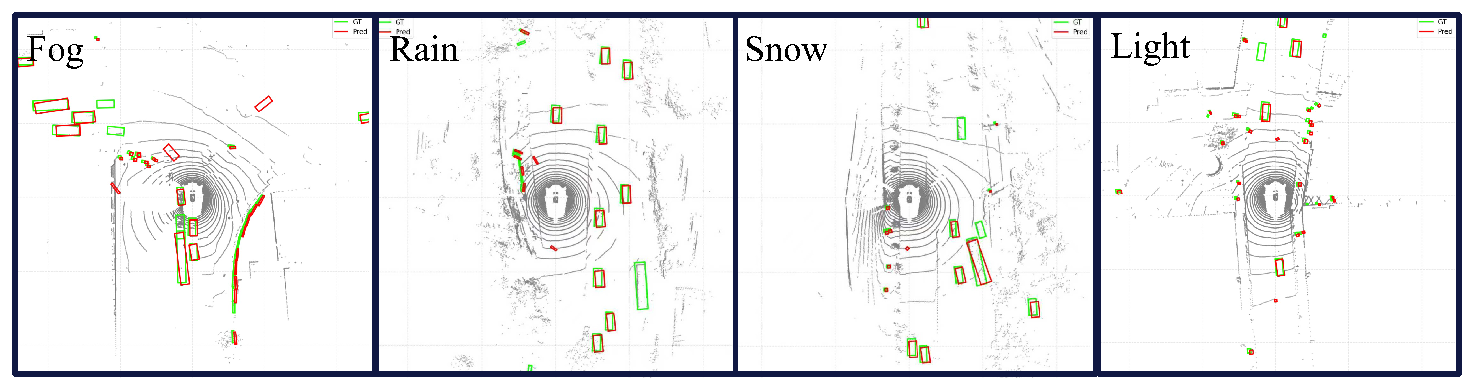 - Huang, X.; Wu, H.; Li, X.; Fan, X.; Wen, C.; Wang, C. Sunshine to Rainstorm: Cross-Weather Knowledge Distillation for Robust 3D Object Detection. In Proceedings of the Thirty-Eighth AAAI Conference on Artificial Intelligence, AAAI 2024, Vancouver, BC, Canada, 20–27 February 2024; Wooldridge, M.J., Dy, J.G., Natarajan, S., Eds.; AAAI Press: Menlo Park, CA, USA, 2024; pp. 2409–2416. [Google Scholar] [CrossRef]