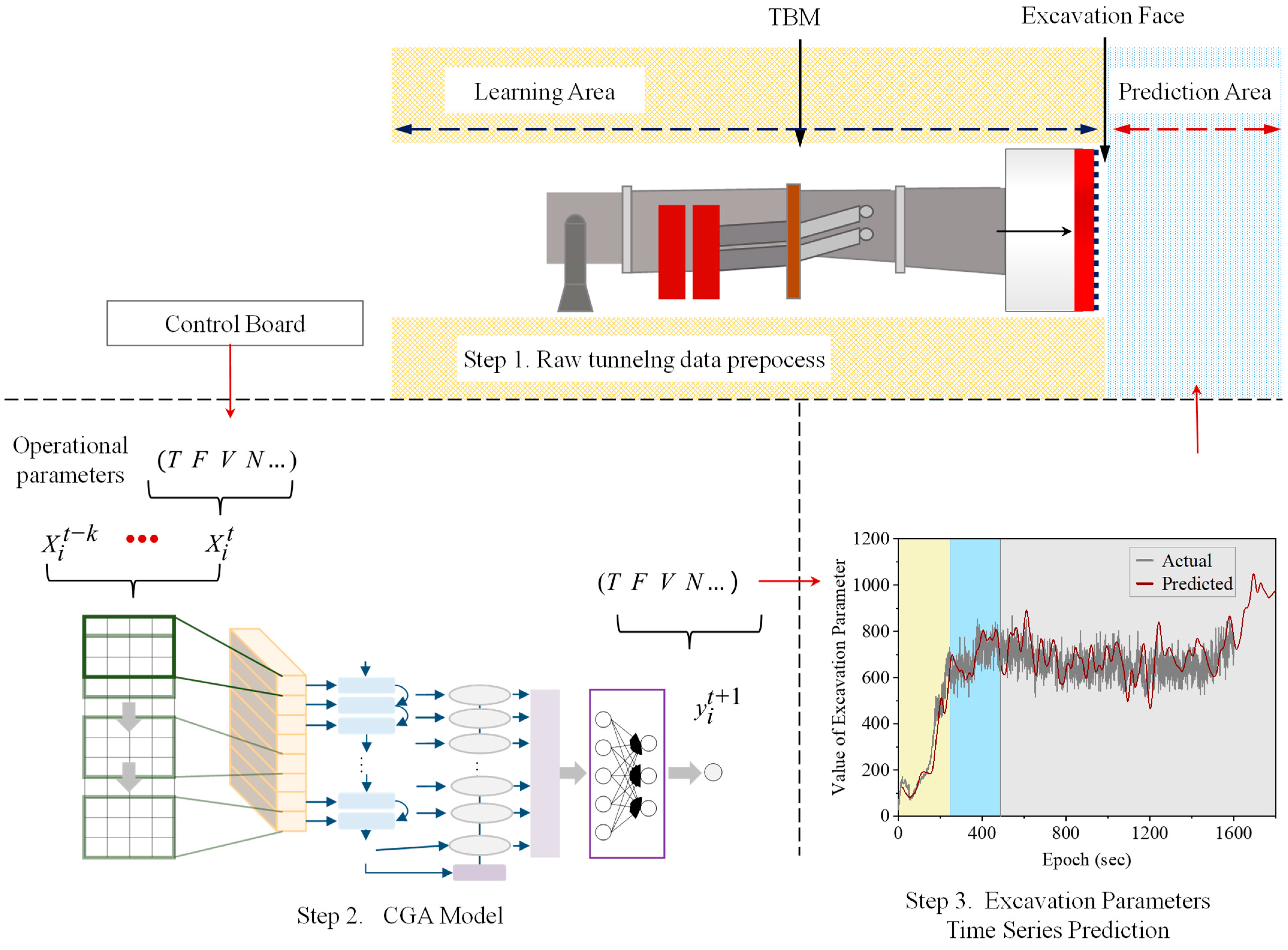 - The integration of convolutional feature extraction and GRU-based temporal modeling enables the CGA model to effectively capture both local temporal patterns and long-term dependencies in multivariate TBM operational data. The attention mechanism further enhances the model by adaptively focusing on the most informative time steps within the sequence.