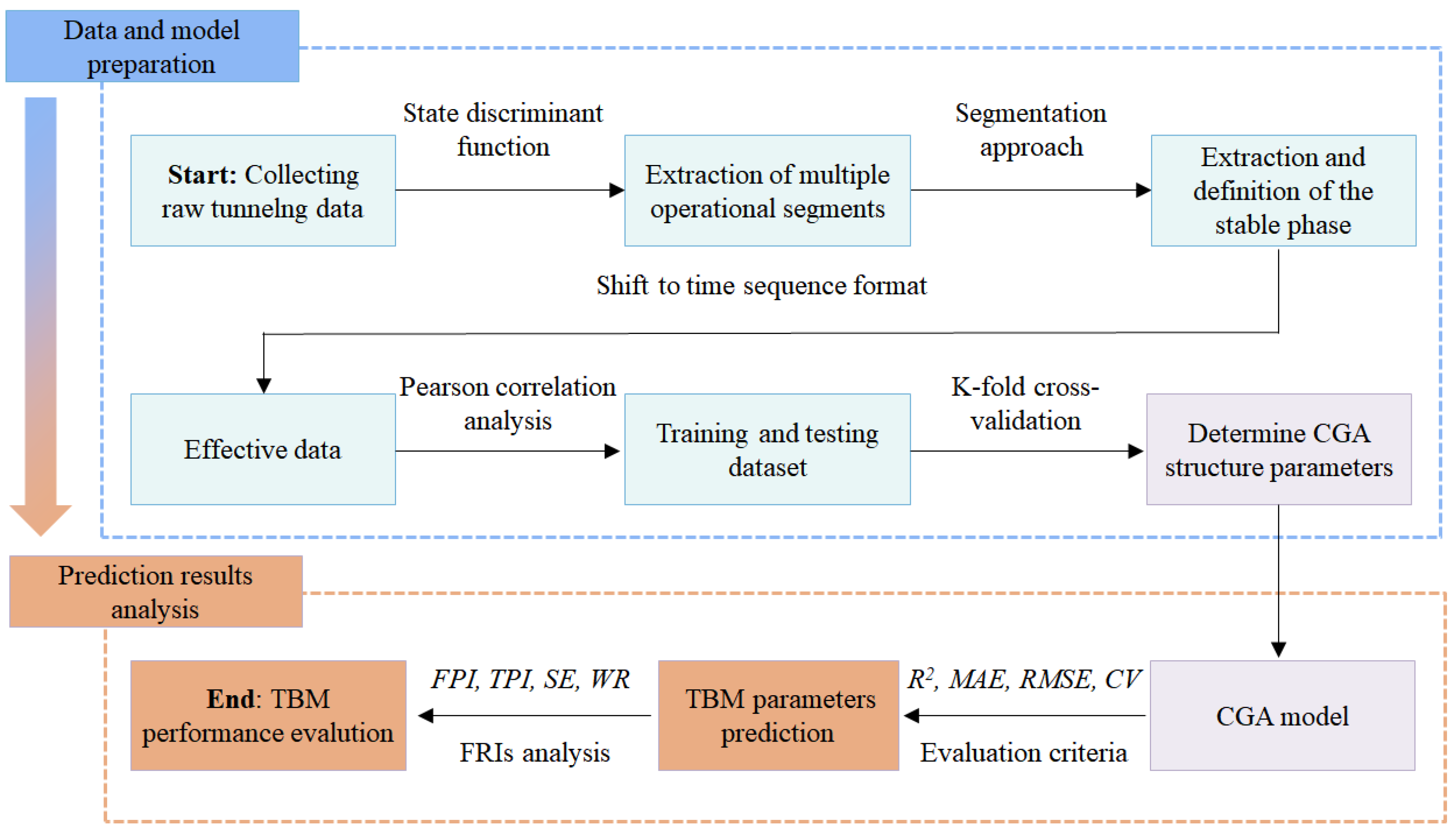- The CGA model demonstrated superior predictive performance for TBM parameters like total thrust and cutterhead torque. The HP filter reduced noise in time series data, improving stability and error metrics (0.883 for total thrust, 0.923 for cutterhead torque) and outperforming traditional models like GRU and BPNN.