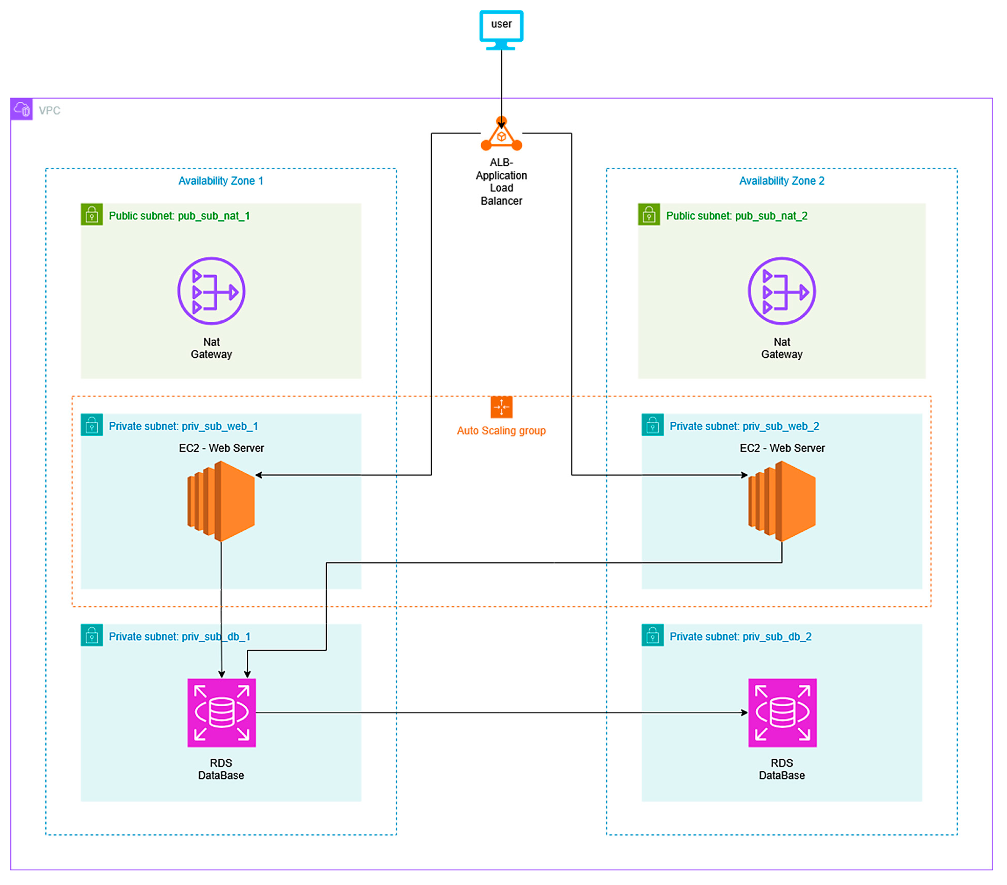 Terraform utilized six distinct HCL modules (vpc, nat, alb, sec_group, web, database), each contained in its own directory and managed by a single orchestration file. This framework facilitated a clear delineation of responsibilities and localized adjustments without disrupting inter-component operations.