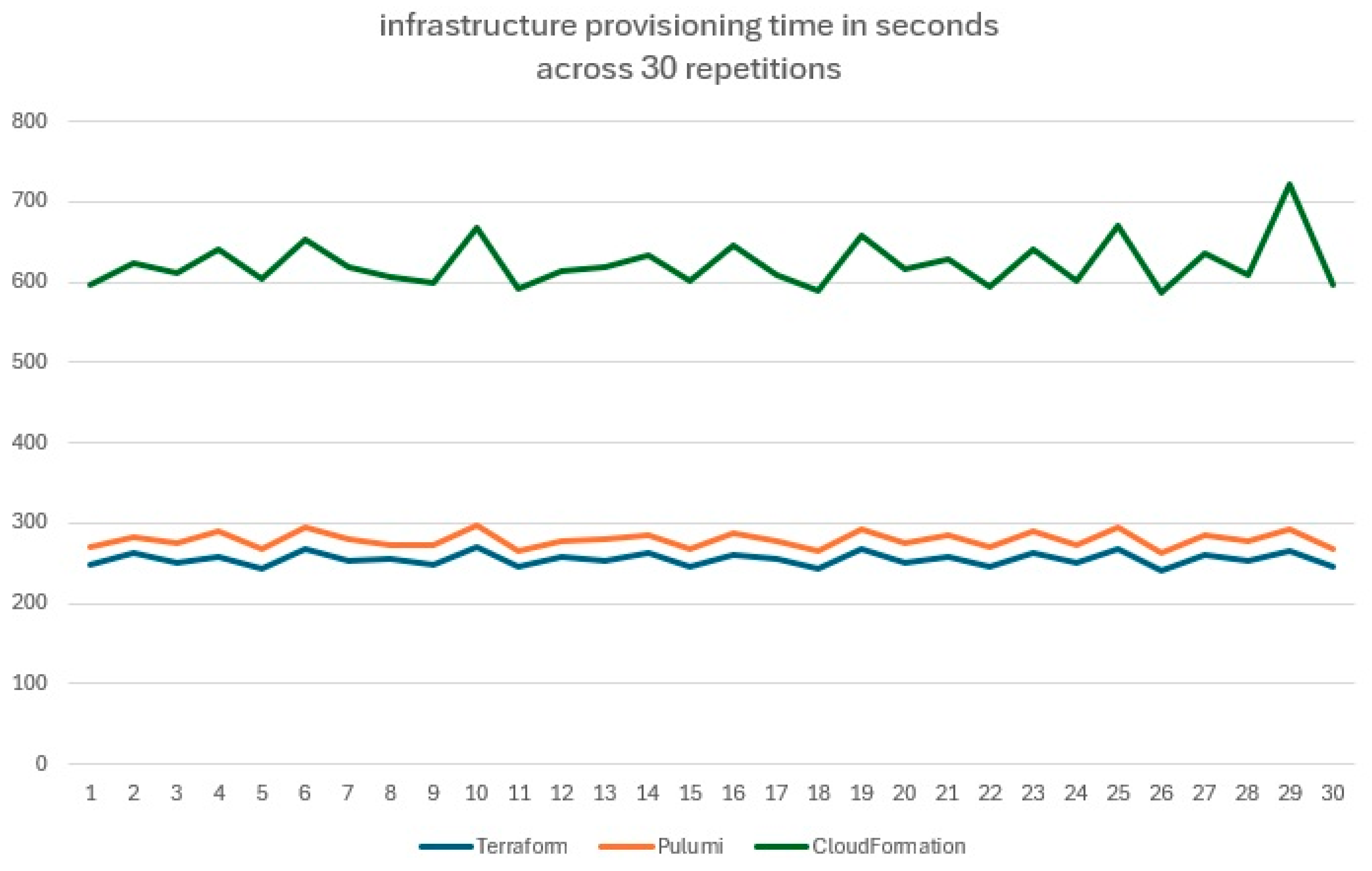 To ensure measurement consistency, all temporal measurements were collected using automated shell scripts that recorded Unix timestamps immediately before and after each operational phase of the deployment process. Each phase was executed via the command-line interfaces of the corresponding tools (Terraform CLI, Pulumi CLI, and AWS CLI for CloudFormation). At the same time, the logging script recorded the start and end times for the startup, planning, provisioning, and destruction stages.