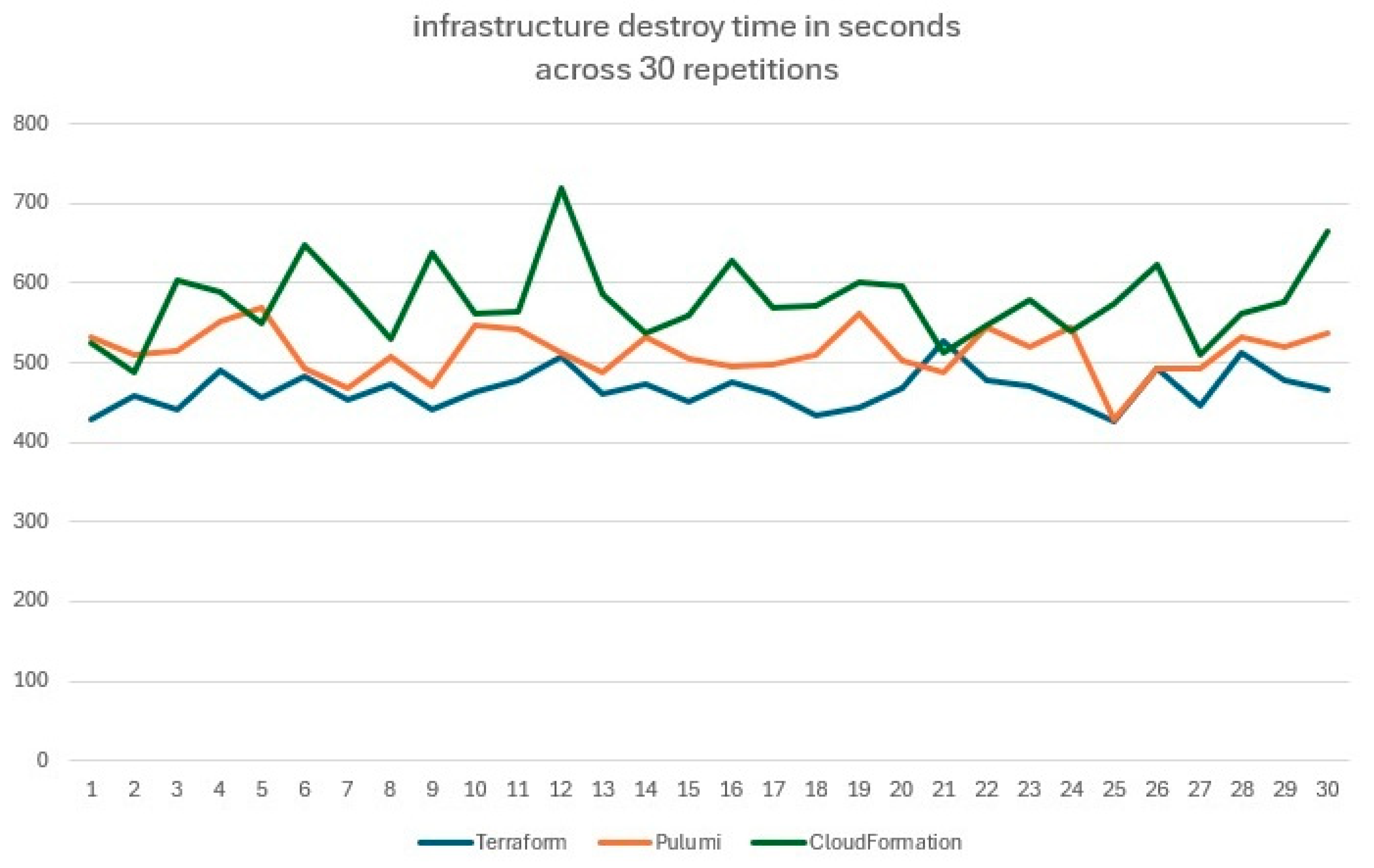 All trials were performed within Amazon Web Services (AWS). Terraform and Pulumi are multi-cloud platforms, but CloudFormation is specific to AWS. The native integration of CloudFormation may affect deployment behavior in varying ways across distinct resource types and service APIs. No persistent deployment failures were observed across the 30 repeated cycles for any tool.