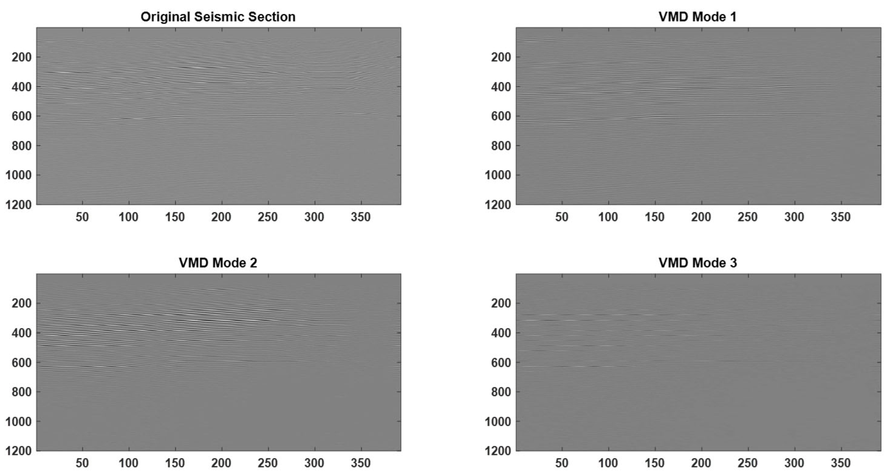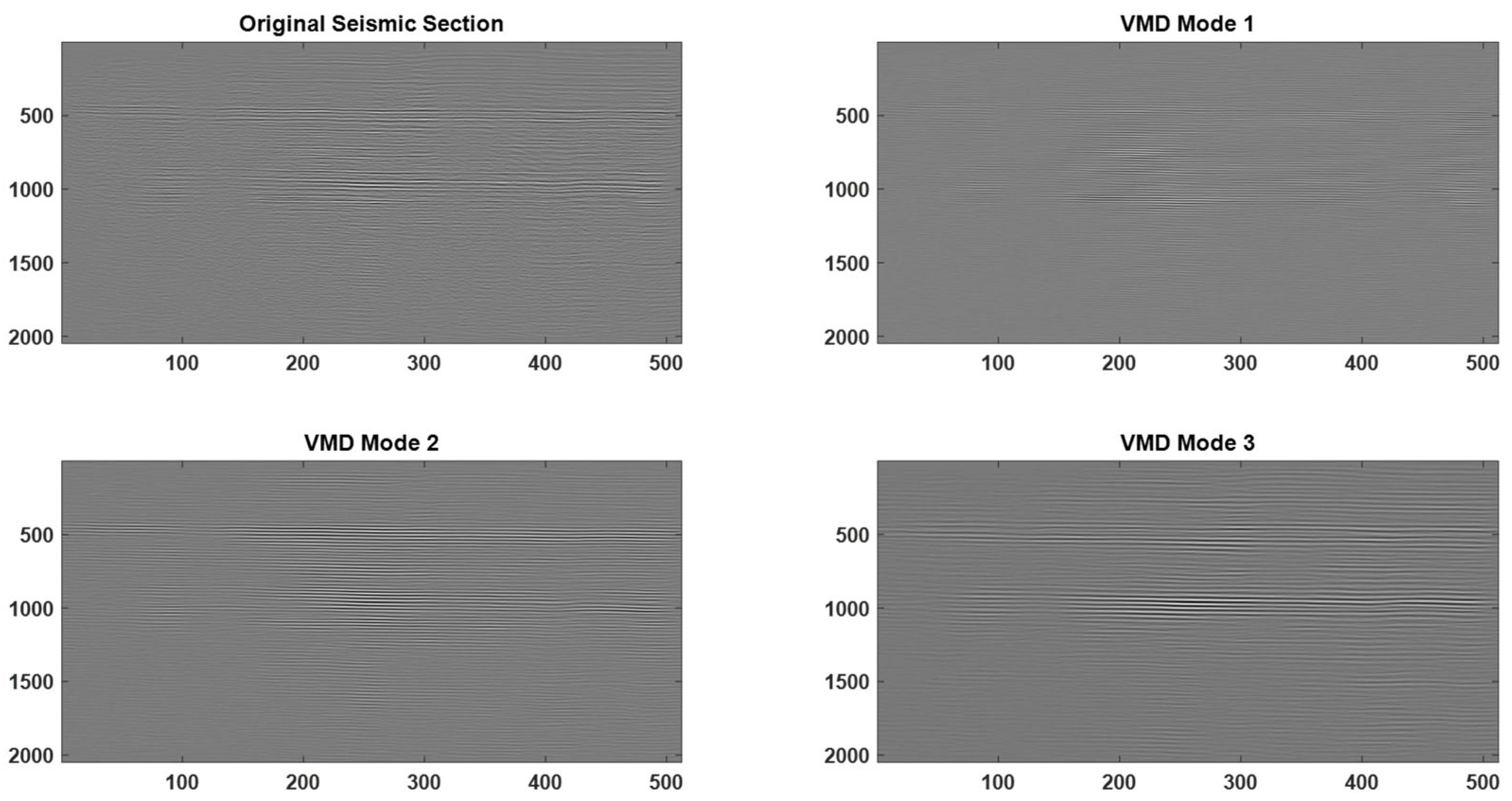 - Apply 2D-VMD: Decompose a seismic slice (inline, crossline, or time slice) into intrinsic mode functions (IMFs), each capturing distinct frequency bands.