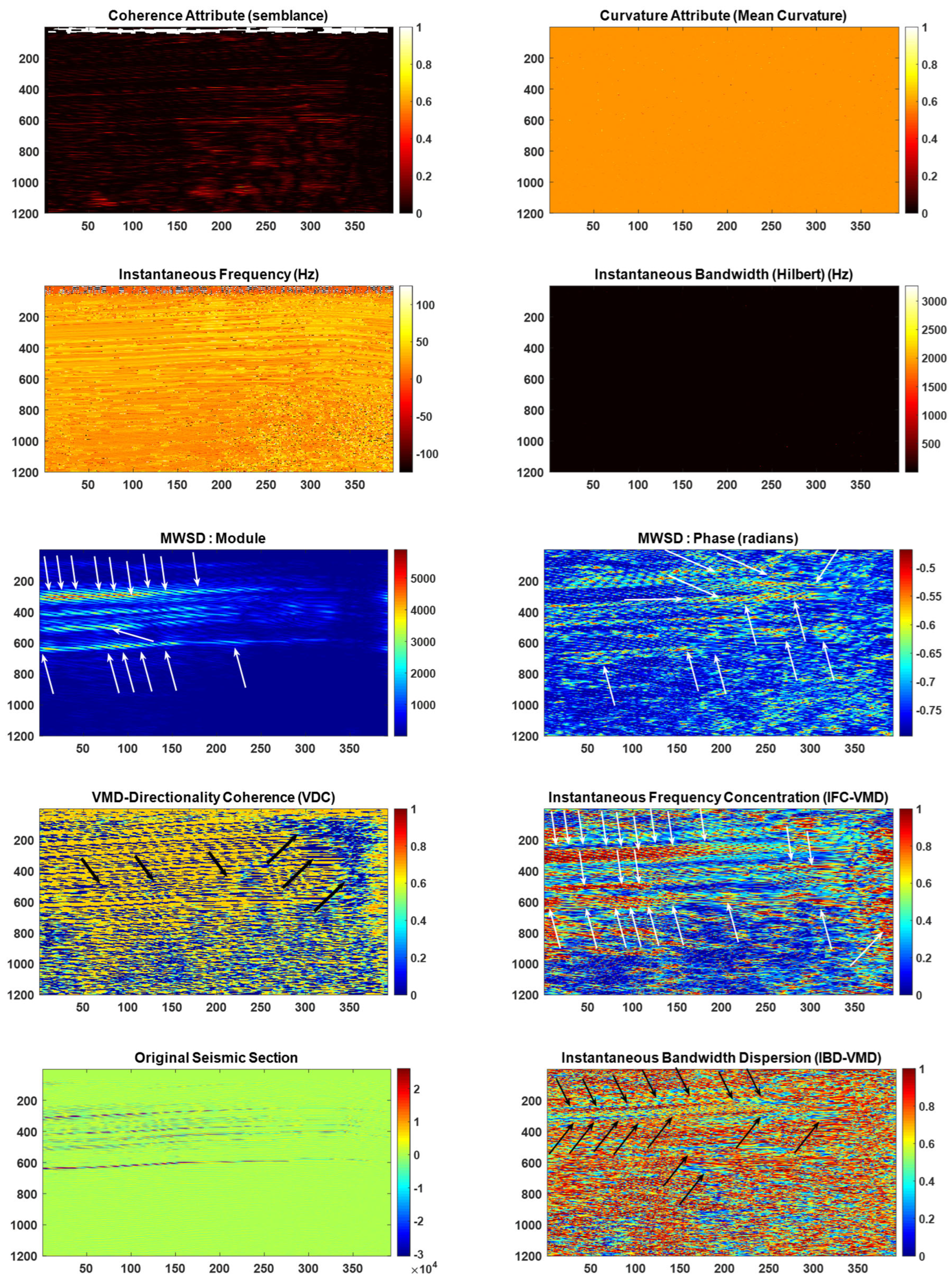 - Gaci, S.; Farfour, M. Chapter 12: New Bidimensional Empirical Mode Decomposition-Based Seismic Attributes. In Methods and Applications in Petroleum and Mineral Exploration and Engineering Geology; Gaci, S., Farfour, M., Eds.; Elsevier: Oxford, UK, 2021; pp. 203–211. [Google Scholar]