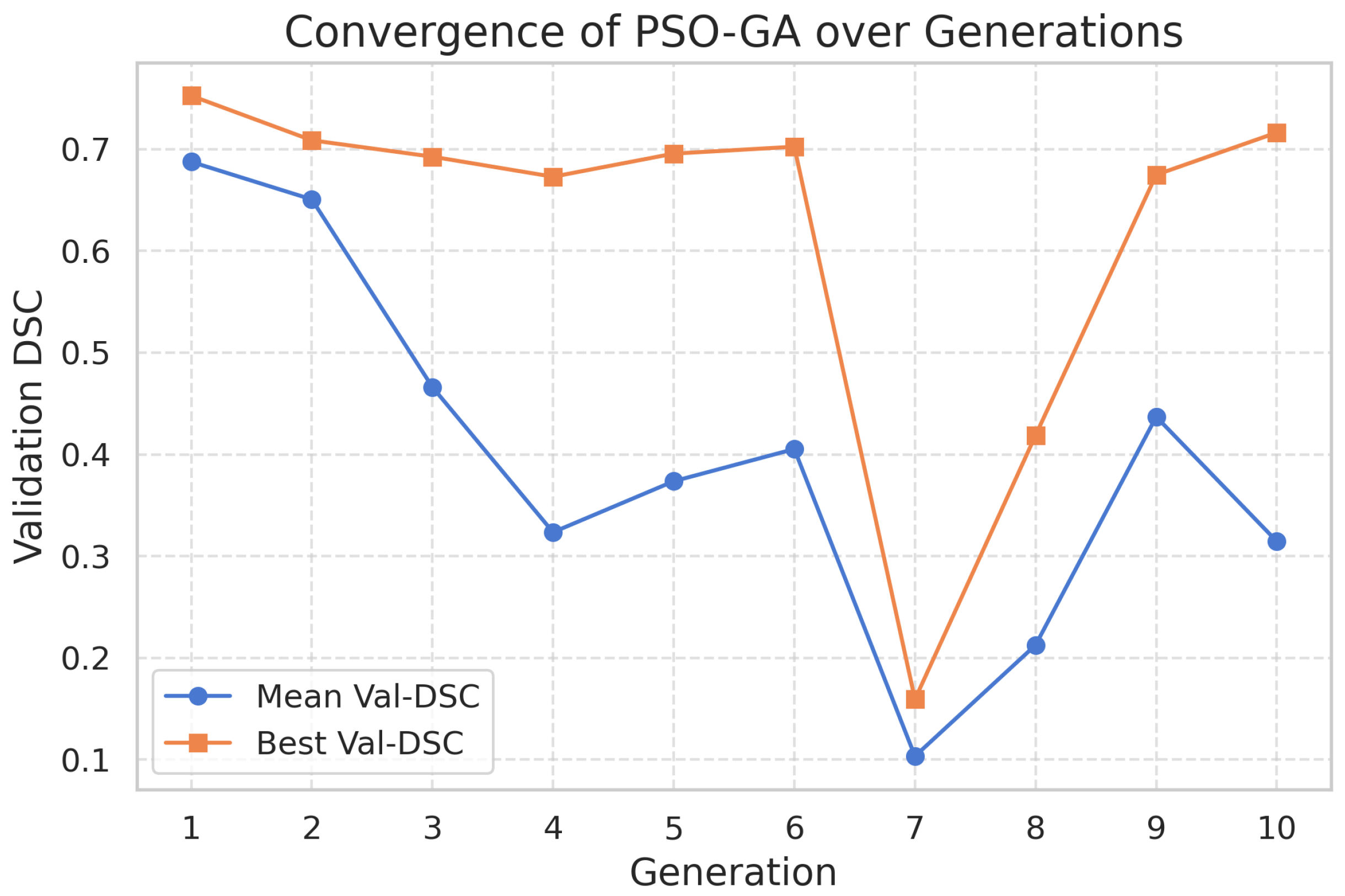 - We designed a novel hybrid metaheuristic optimization framework (PSO-GA-U-Net) that integrates PSO and a GA to jointly optimize the learning rate dynamics and dropout rates in U-Net for brain tumor segmentation.