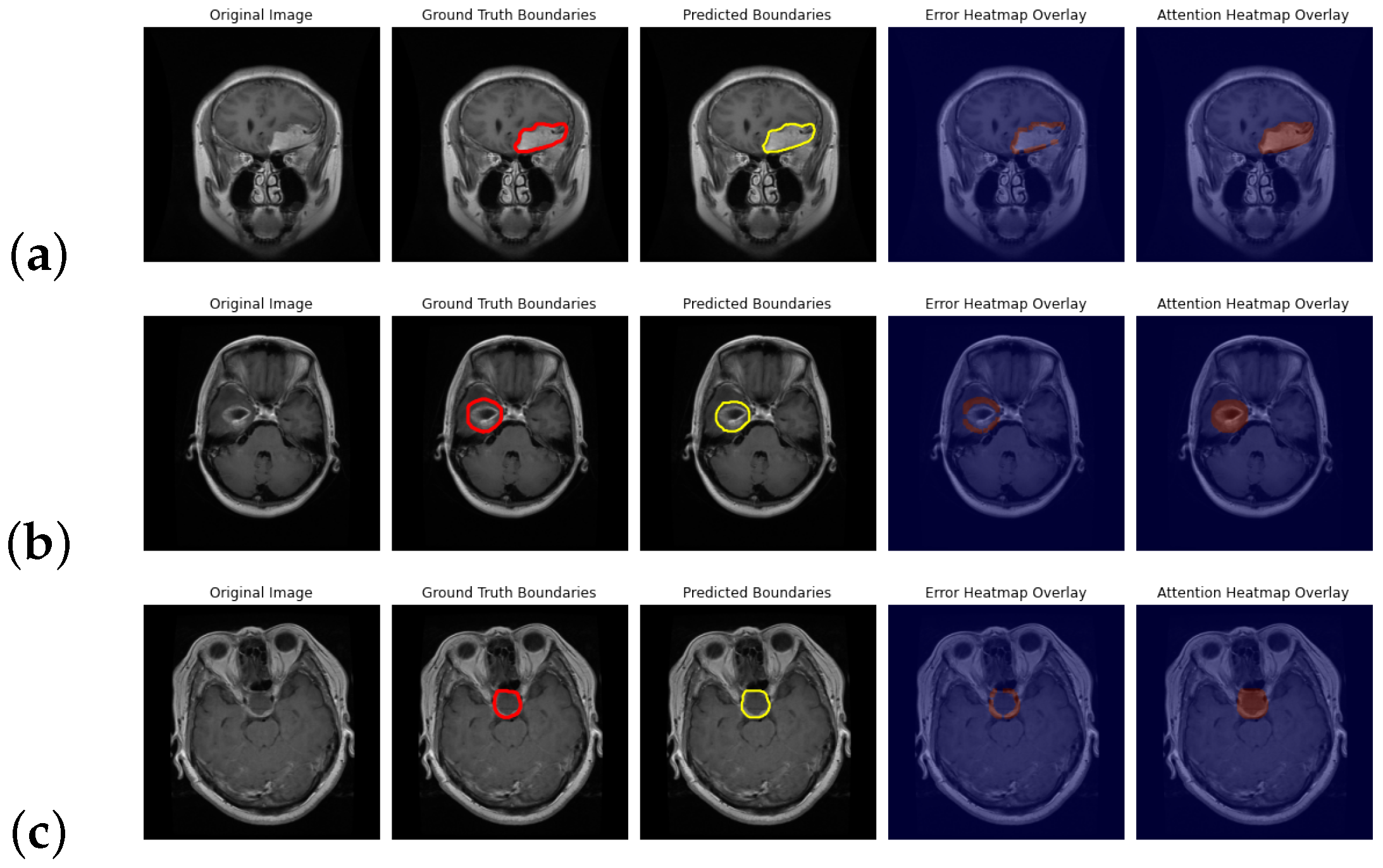 - The evaluation covers diverse tumor types (meningioma, glioma, and pituitary, HGG, LGG) and MRI modalities (T1CE, FLAIR, T1, and T2), with consistent superiority in DSC and JI compared to transformer-based, residual, and attention-enhanced models.