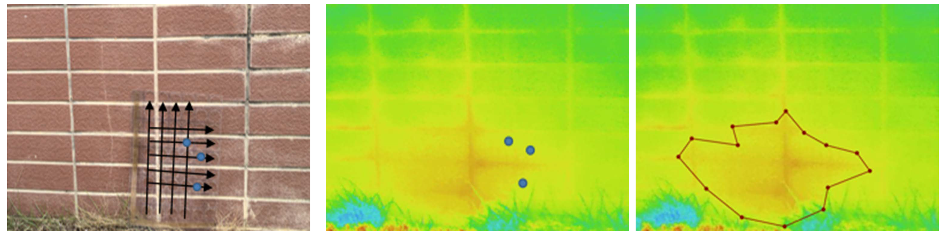 17], the thermal images were processed with a 2–3 color display mode. When the surface temperature difference between the red and green areas exceeded the quantitative threshold of 1 °C specified in the specifications, the red areas were judged as hollow defects. Combined with the color gradient distribution characteristics, the boundary of the yellow area was determined as the hollow defect boundary. This yellow area lies in the transition zone between the red hollow defect areas and the green intact areas. Further verification can be conducted using hardness testing. During the testing process, after estimating the extent of hollowing using an infrared thermal imaging camera, multiple survey lines were arranged within the estimated range on the exterior wall using a measuring scale. Hardness tests were then carried out along these survey lines with a hardness tester, and the points where abrupt changes in hardness values occurred were connected to define the hollow defect boundary. The testing process is shown in
