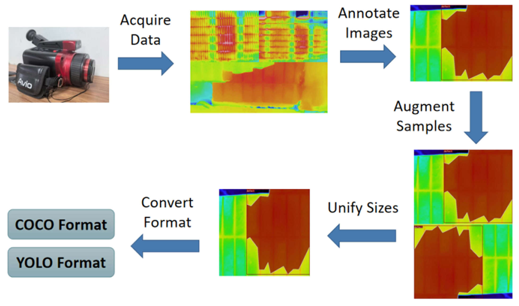 In the data annotation stage, the infrared thermal images were annotated by an experienced operator with professional knowledge of building exterior wall defects and infrared thermography, using the Labelme image annotation software (version 5.6.1). After annotation, all images were uniformly converted to COCO format or YOLO format, and randomly divided into training, validation, and test sets at a ratio of 7:2:1. To enhance the generalization ability of the model, data augmentation techniques were applied to the training, validation, and test sets in proportion to their sizes, expanding the original sample set to 3200 samples. This approach not only ensured consistent data distribution across the sets and avoided data leakage but also effectively enriched sample diversity, providing reliable support for stable model training. The dataset construction process is shown in