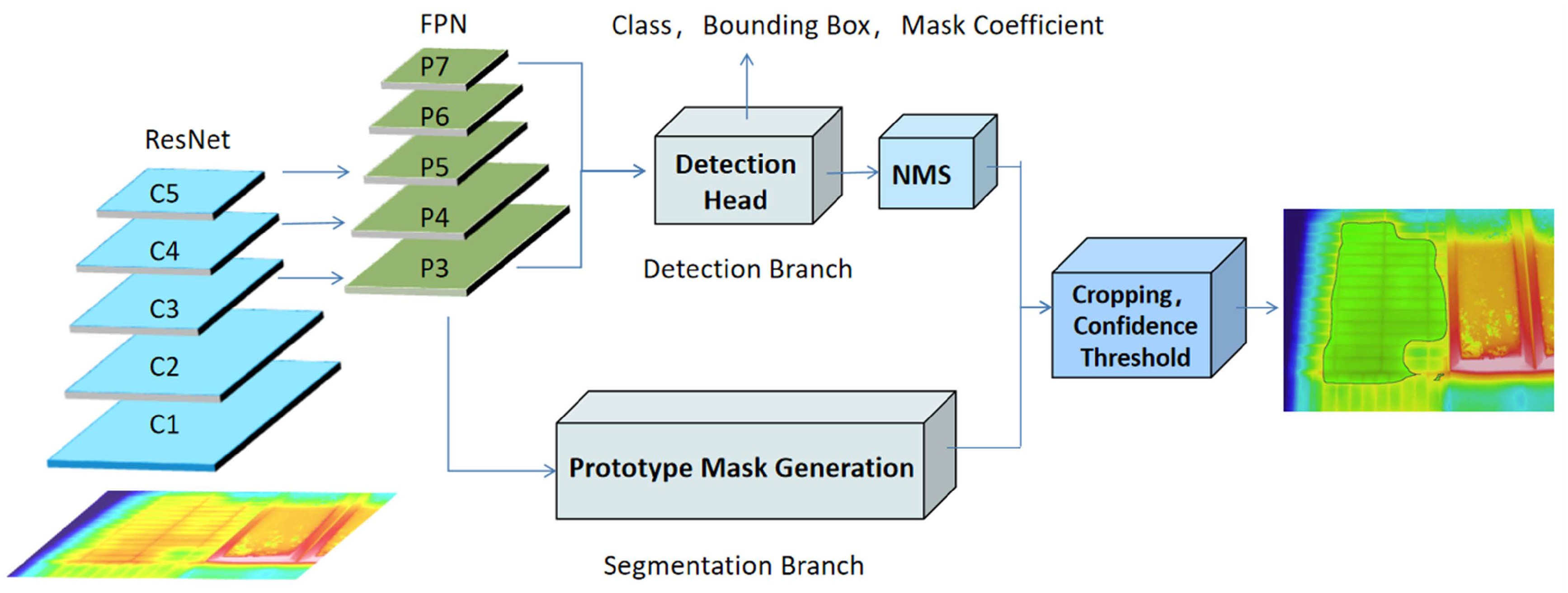 Step 2: Send the generated multi-scale fused feature maps to two parallel task branches in parallel. One is the Protonet branch, which predicts a set of prototype masks based on the fused features output by FPN. These prototype masks serve as a shared basis for generating all instance masks. They can adapt to hollow defects of different morphologies through linear combination, avoiding the problem of insufficient mask adaptability caused by differences in hollow defect shapes. The other is the Prediction Head branch, which is responsible for predicting class probabilities, bounding box offsets, and mask coefficients for multi-scale anchor boxes.