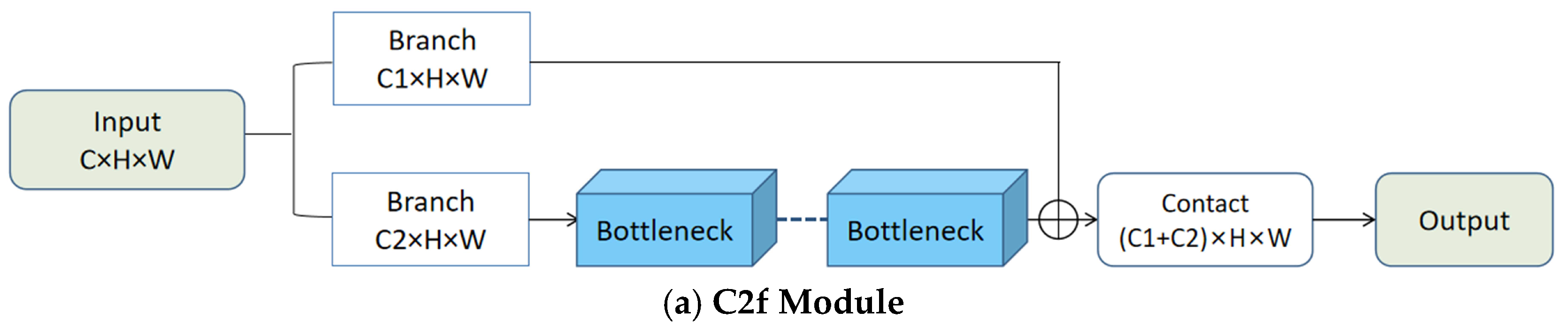 The C2f module in the YOLOv8 backbone network adopts a dual-branch parallel processing structure: First, the module divides the input feature map into two branches. The first branch directly retains the original features, while the second branch performs feature transformation through multiple Bottleneck units, and finally outputs the fused features. The specific structure of the module is shown in