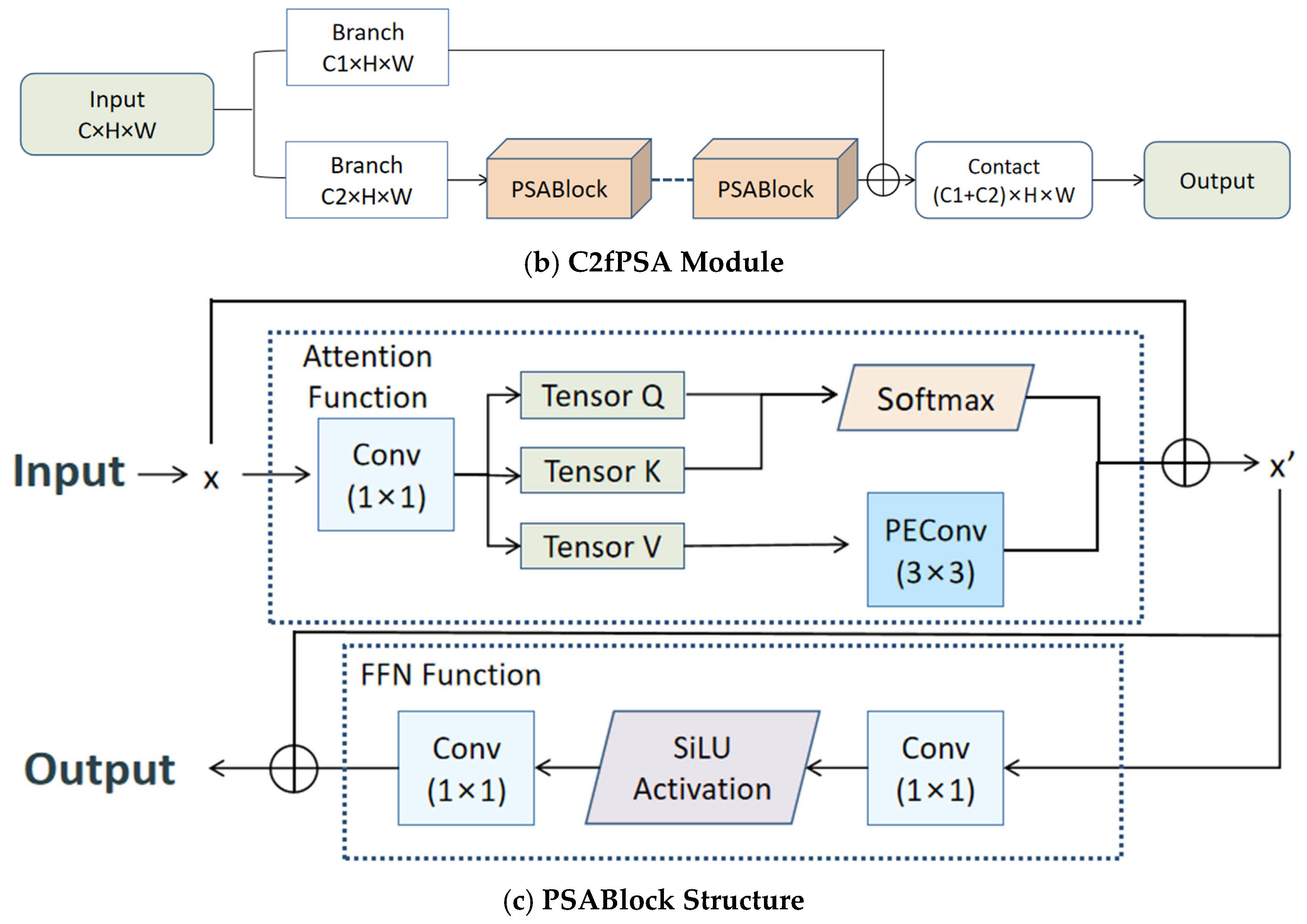 In practical engineering scenarios, the thermal imaging of hollow defects is characterized by blurred boundaries and a continuous color transition with intact wall surfaces. Moreover, it is subject to noise interferences such as wall jointing lines and material aging, and the thermal signal contrast of micro hollow defects is even lower, which imposes higher requirements on the model’s feature focusing and anti-interference capabilities. Although the C2f module in the YOLOv8 backbone network can efficiently extract features, it lacks targeted attention to the key regions of hollow defects. This results in the model being susceptible to interference in complex backgrounds, with room for improvement in its boundary fitting and micro hollow defect capture capabilities. To address this issue, this study proposes a lightweight improvement scheme: the C2f modules at key levels in the YOLOv8 backbone network are replaced with the C2fPSA module integrated with the Position-Sensitive Attention (PSA) mechanism, so as to strengthen the model’s focus on the key features of hollow defects. The design principles and structural details of the C2fPSA module are elaborated in detail below.