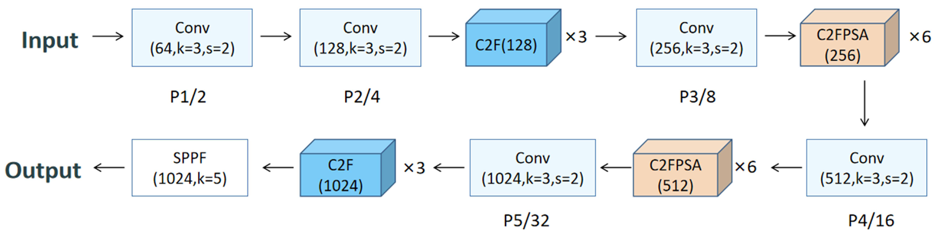 Considering that the details and boundary information of hollow defects are mainly contained in the middle and high-level features, this study selects to replace the C2f modules at two scale levels (P3/8 and P4/16) in the YOLOv8 backbone network with C2fPSA modules, while keeping the rest of the structure unchanged. This design directly embeds the attention mechanism into the feature levels that are more sensitive to small hollow defects and boundary details, thereby enhancing the model’s ability to represent key regions. The schematic diagram of the improved YOLOv8 backbone network framework and the replacement positions is shown in