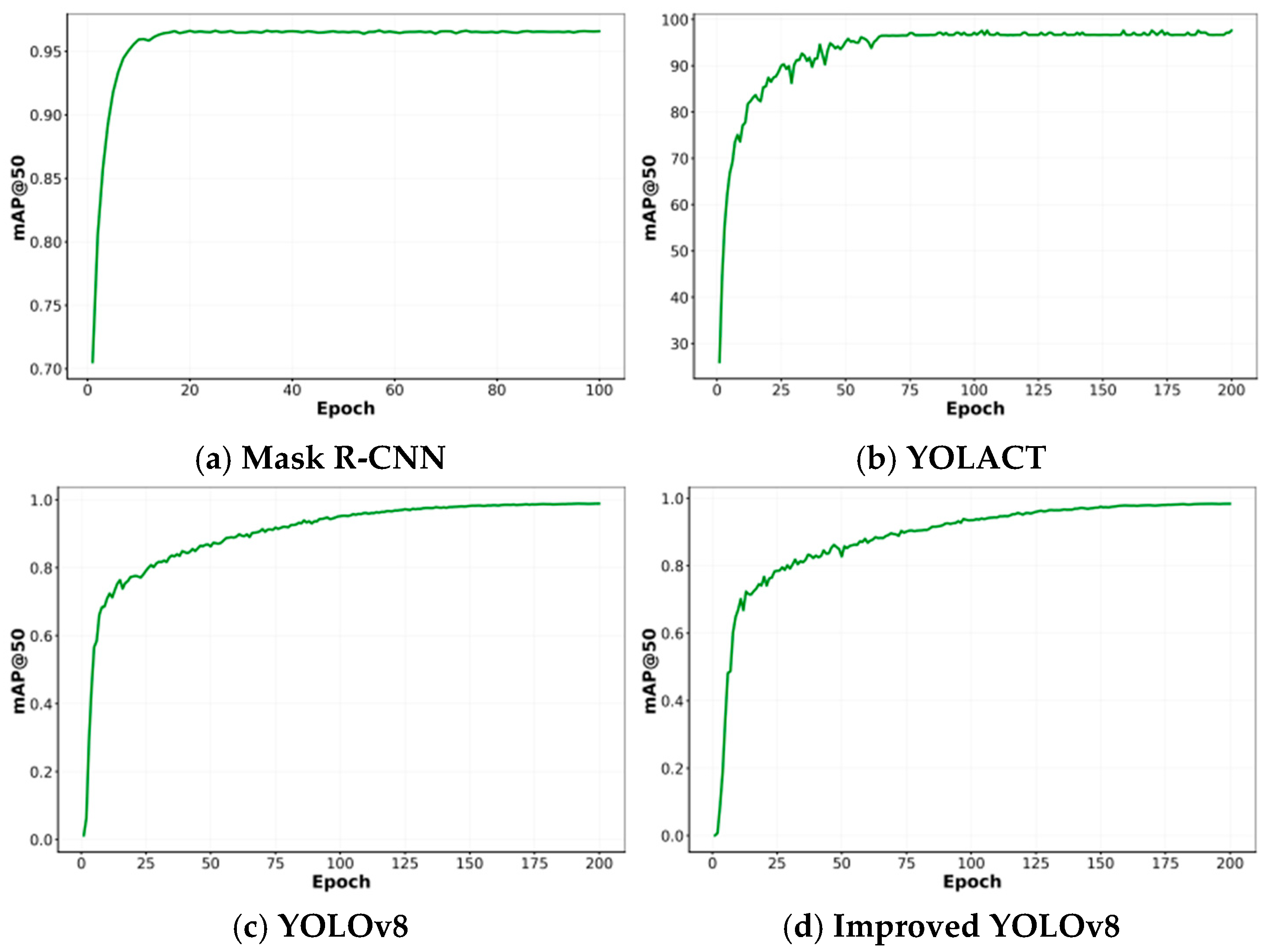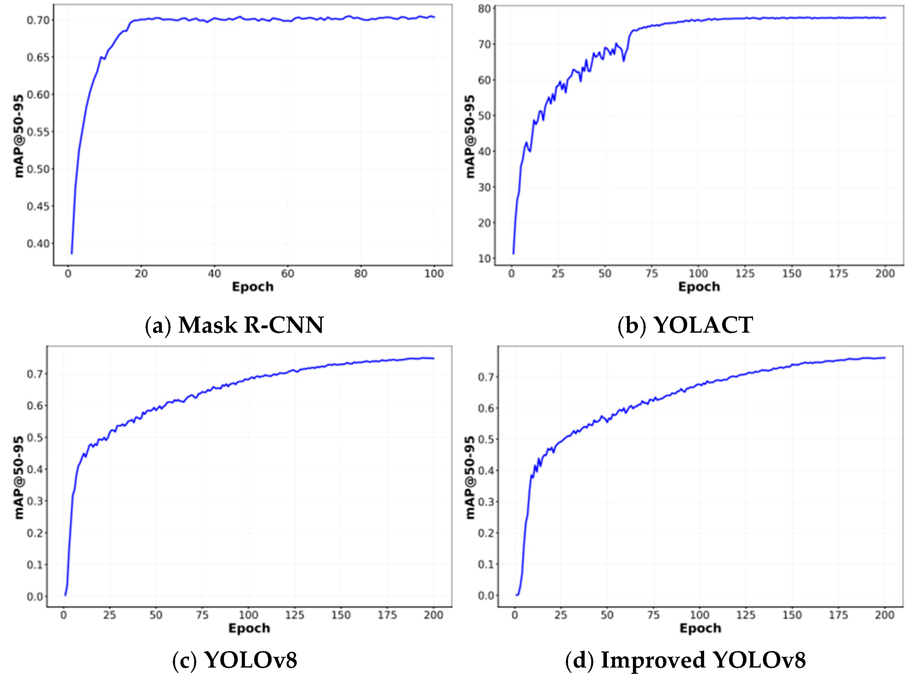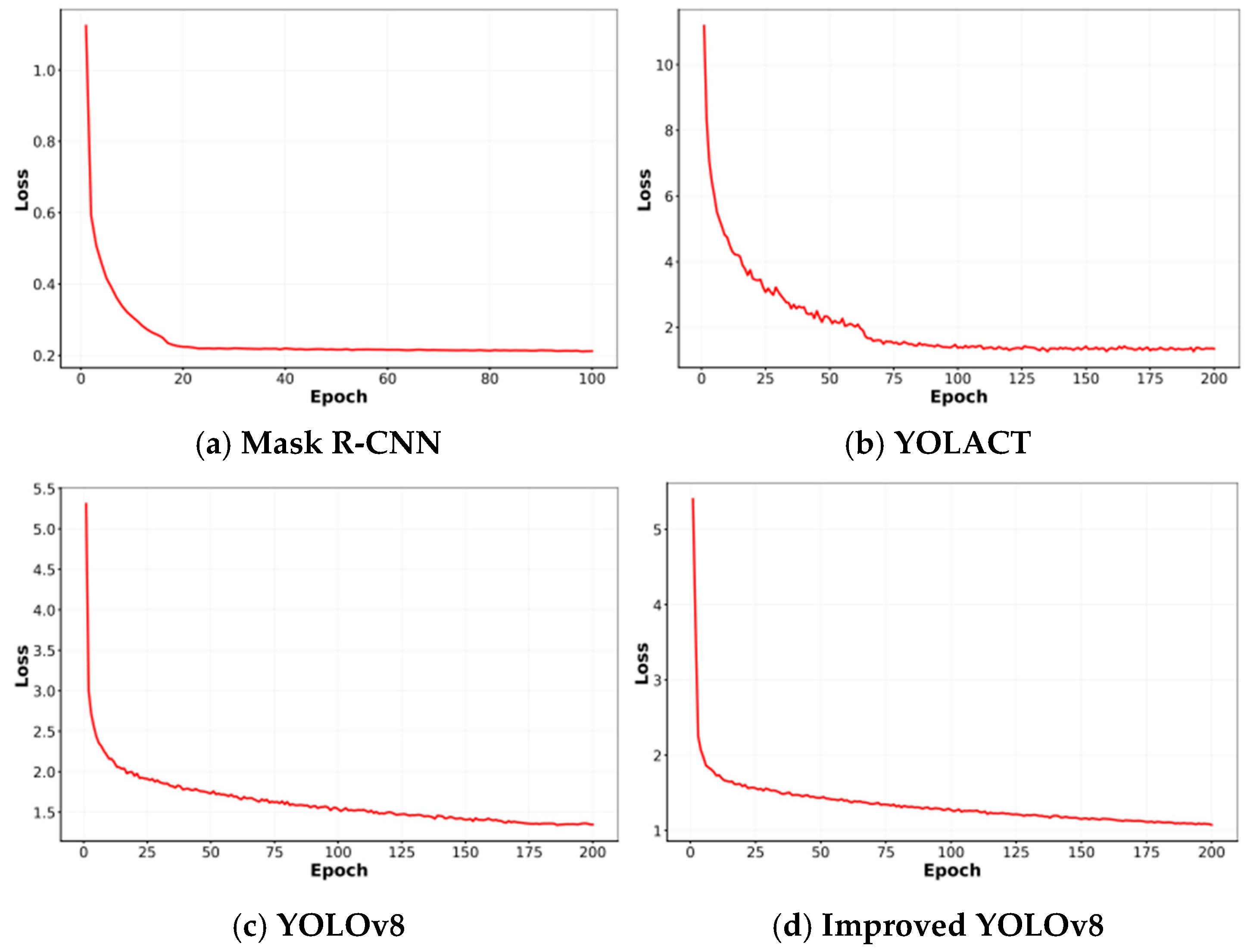 This study was conducted on the Ubuntu 22.04 operating system, with hardware configurations including an AMD EPYC 9754 128-core processor and an NVIDIA RTX 4090D graphics card (24 GB video memory). PyTorch 2.3.0 was adopted for model training, and CUDA 12.1 was used to accelerate computation. The training batch size was set to 12. The total number of training epochs for Mask R-CNN was 100, while YOLACT and YOLOv8 (with slower convergence speeds) were set to 200 training epochs in total. All models used the Stochastic Gradient Descent (SGD) optimizer, with a momentum of 0.9 and a learning rate of 0.02. The input resolution was uniformly set to 640 × 480 (the default resolution of the infrared camera used for data acquisition). To ensure statistical significance, each experiment was repeated three times with random seeds, and the average results are reported. Additionally, all models were initialized with the default pre-trained weights provided by their official frameworks, which are pre-trained on the COCO dataset.