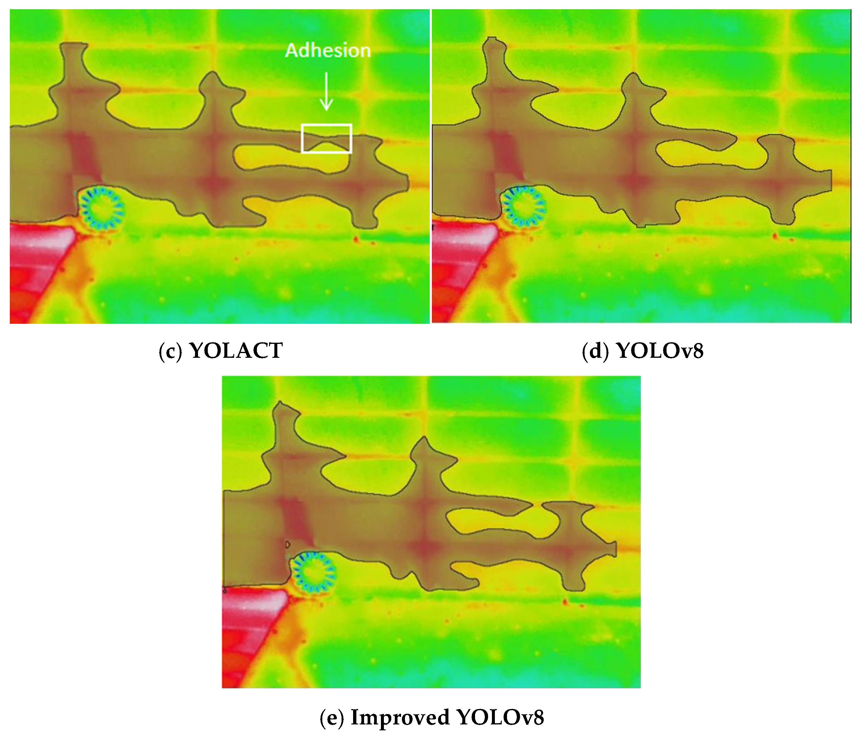 YOLACT achieves the best overall segmentation performance among all models, benefiting from the global feature learning mechanism of its prototype masks. Its prototype masks pre-learn the global contours and boundary features of hollow defects, which are then linearly combined with the exclusive mask coefficients predicted for different hollow defects, enabling the generation of highly fitted boundaries. This results in an extremely high degree of fit for independent, scattered hollow defect boundaries, effectively avoiding over-segmentation issues. However, when facing transition zones of adjacent boundaries, the overlapping of multiple masks at the same pixel positions leads to adhesion between the edges of different defects, preventing precise separation of densely adjacent defect boundaries.