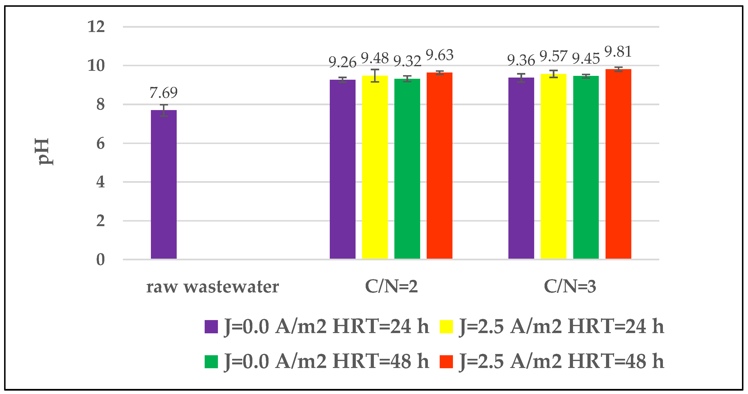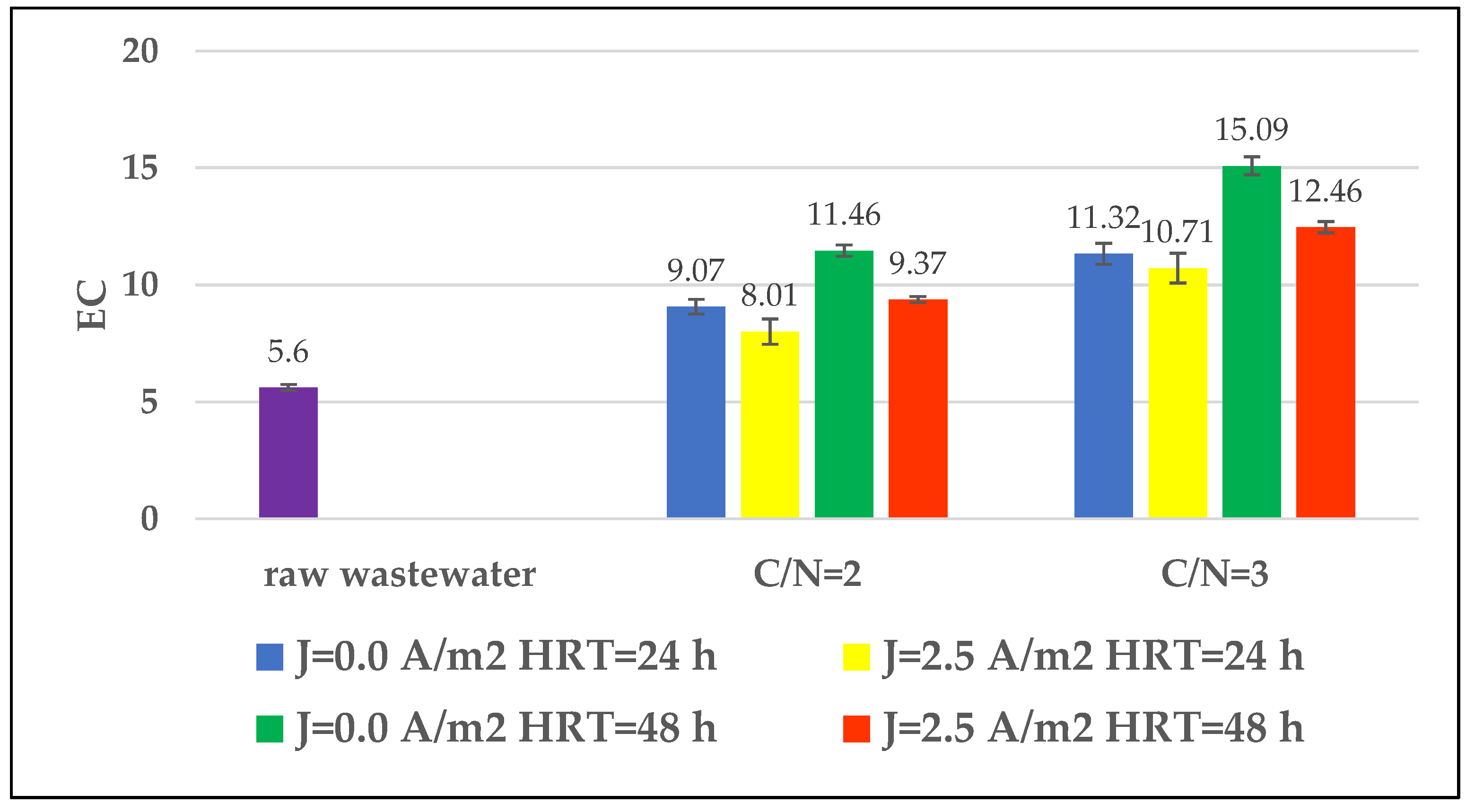 14]. Consequently, although increasing HRT may enhance nutrient removal through more efficient carbon utilization, it may also lead to increased energy demand and lower current efficiency.