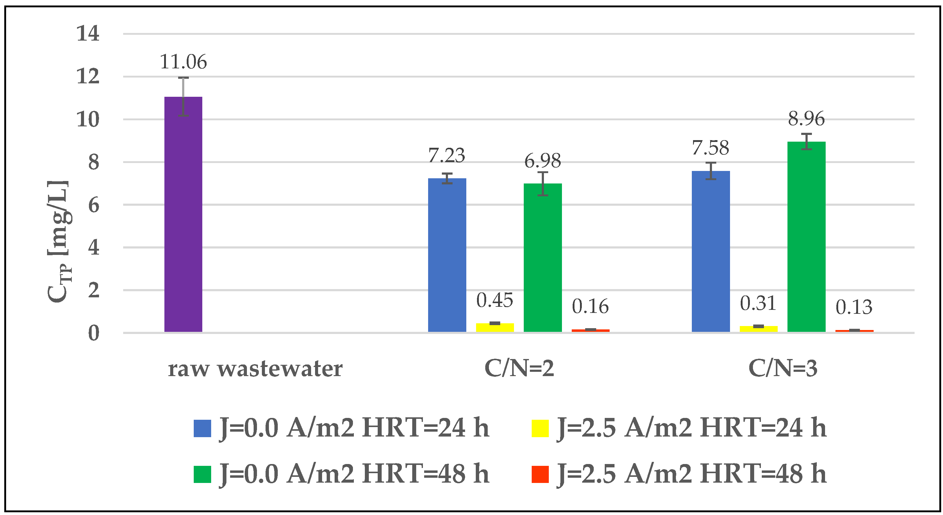 Previous studies conducted by the authors demonstrated that phosphorus removal efficiencies exceeding 90% can be achieved in electro-biological reactors at hydraulic retention times longer than 4 h [