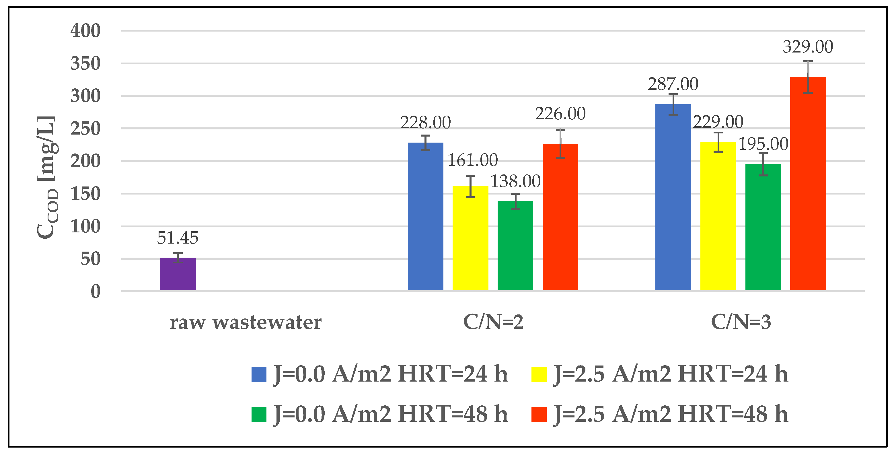 A different trend was observed in the electro-biological reactor. In the REBDC, extending HRT resulted in higher effluent COD. At C/N = 2.0, COD increased from 161.0 ± 16.3 mg O2/L (HRT = 24 h) to 226.0 ± 21.3 mg O2/L (HRT = 48 h). Likewise, at C/N = 3.0, COD increased from 229.0 ± 14.6 mg O2/L to 329.0 ± 24.6 mg O2/L.