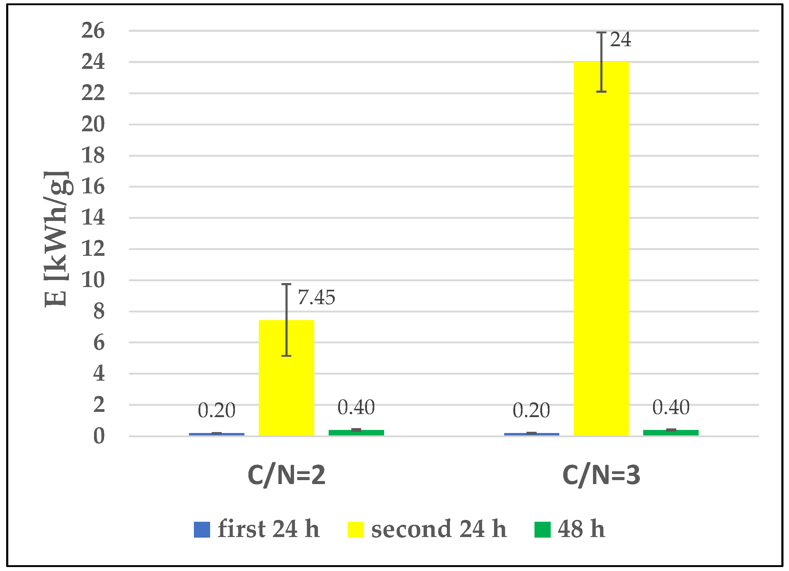 During the second 24 h period of the 48 h cycle, energy consumption increased significantly, reaching 7.45 ± 2.3 kWh/g P at C/N = 2.0 and 24.0 ± 1.9 kWh/g P at C/N = 3.0. The higher value is comparable with results published in a related study [