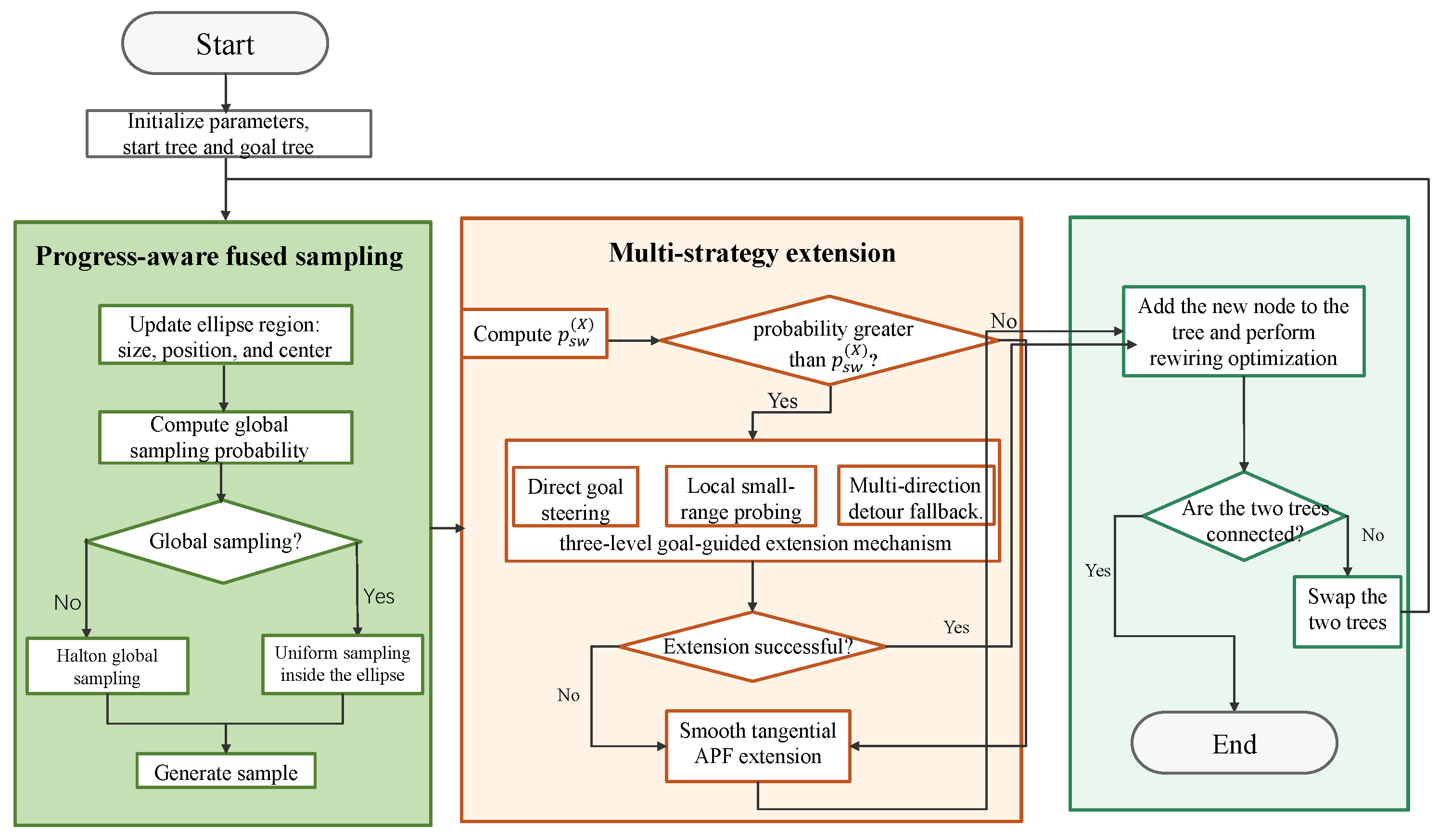 controls the sensitivity of the switching probability to consecutive failures, enabling an adaptive balance between goal-guided extension and APF-based extension. In the APF module, the gains