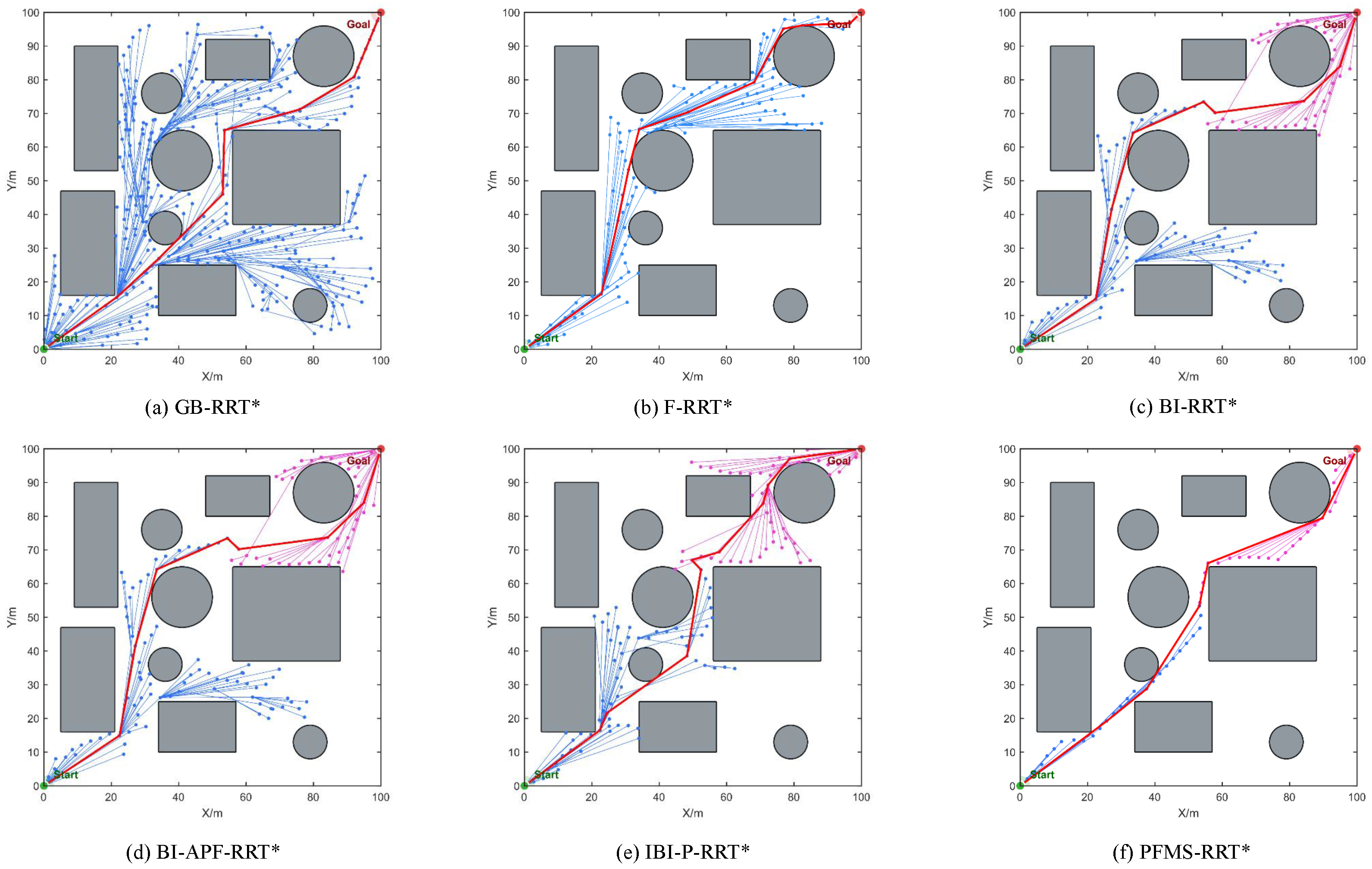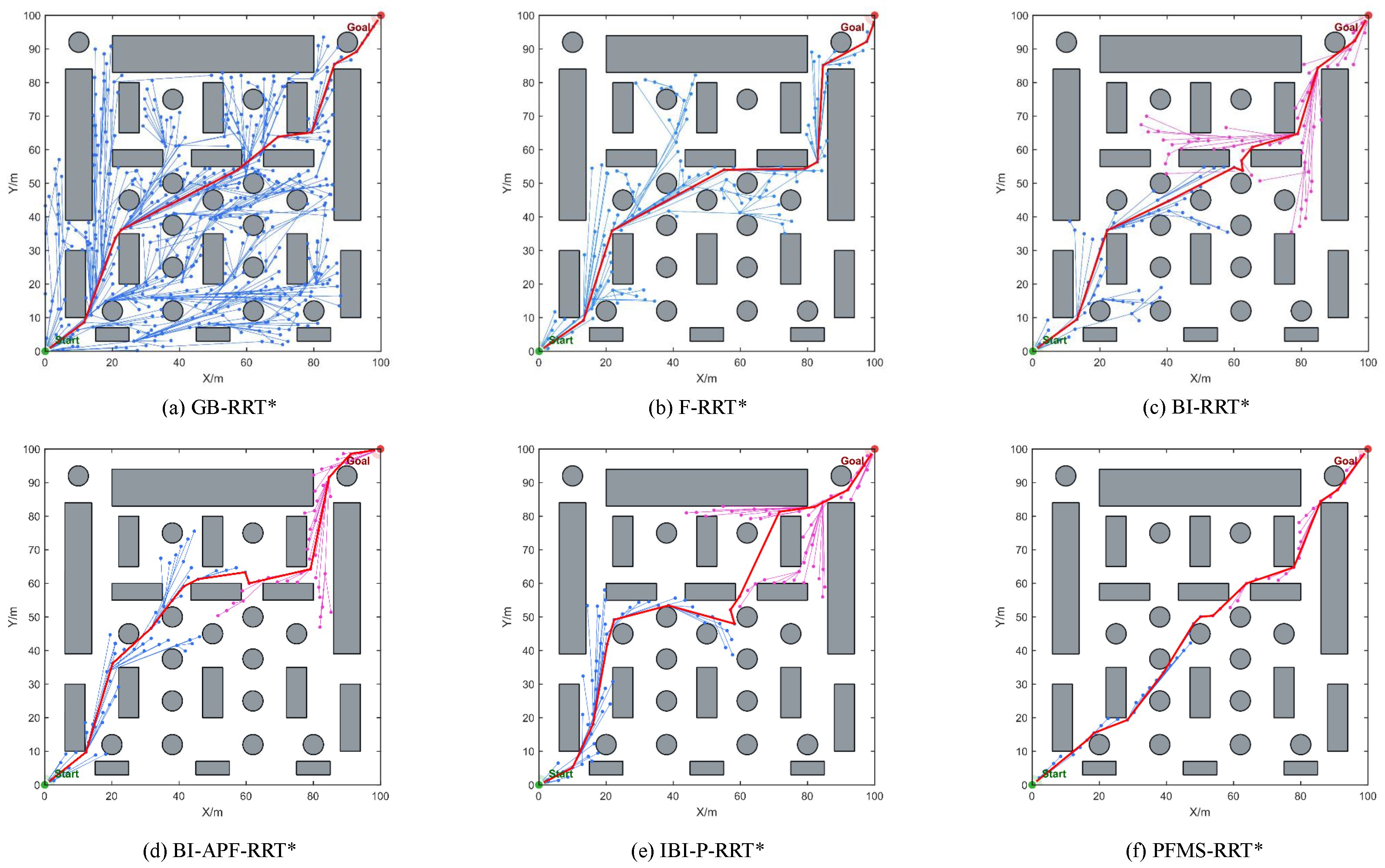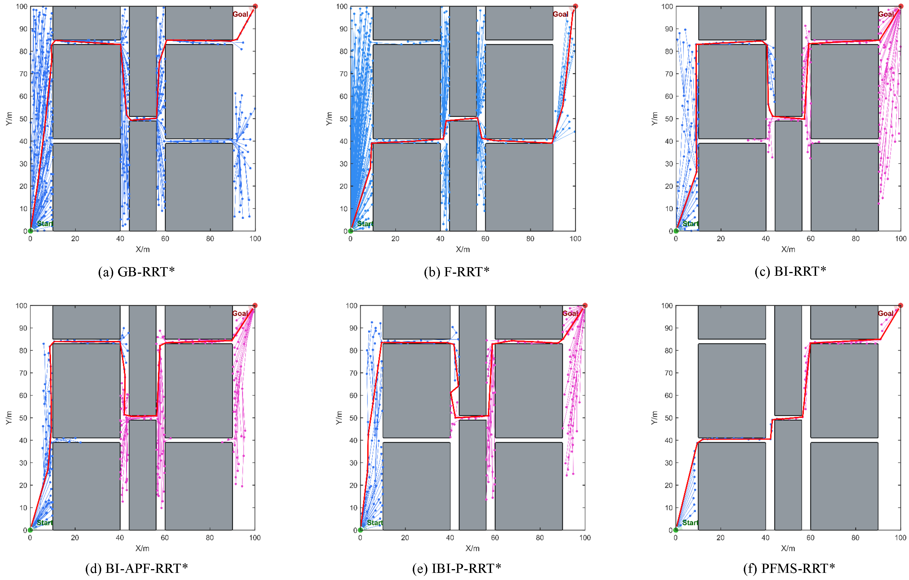 Figure 8, in Environment A, all six path-planning algorithms are able to successfully find a collision-free feasible path from the start to the goal. The red curve denotes the final planned path, while the blue and pink curves indicate the bidirectional search trees expanded from the start and the goal, respectively. However, the differences mainly lie in sampling efficiency and path quality. For GB-RRT* and F-RRT*, the search trees are more dispersed and exhibit more ineffective expansions in the vicinity of obstacles, manifested by repeated growth of the blue and pink branches near obstacles with insufficient utilization of the truly traversable regions. This behavior leads to unnecessary detours and polyline-like corrections in the resulting path. In contrast, PFMS-RRT* concentrates its tree expansion in effective feasible regions, producing more coherent obstacle-avoidance expansions with fewer rollbacks, and thus generating a more compact and smoother path. This phenomenon is directly related to the proposed progress-aware fusion sampling strategy. As a result, ineffective sampling around obstacle neighborhoods and redundant nodes are significantly reduced, improving both convergence efficiency and path quality.