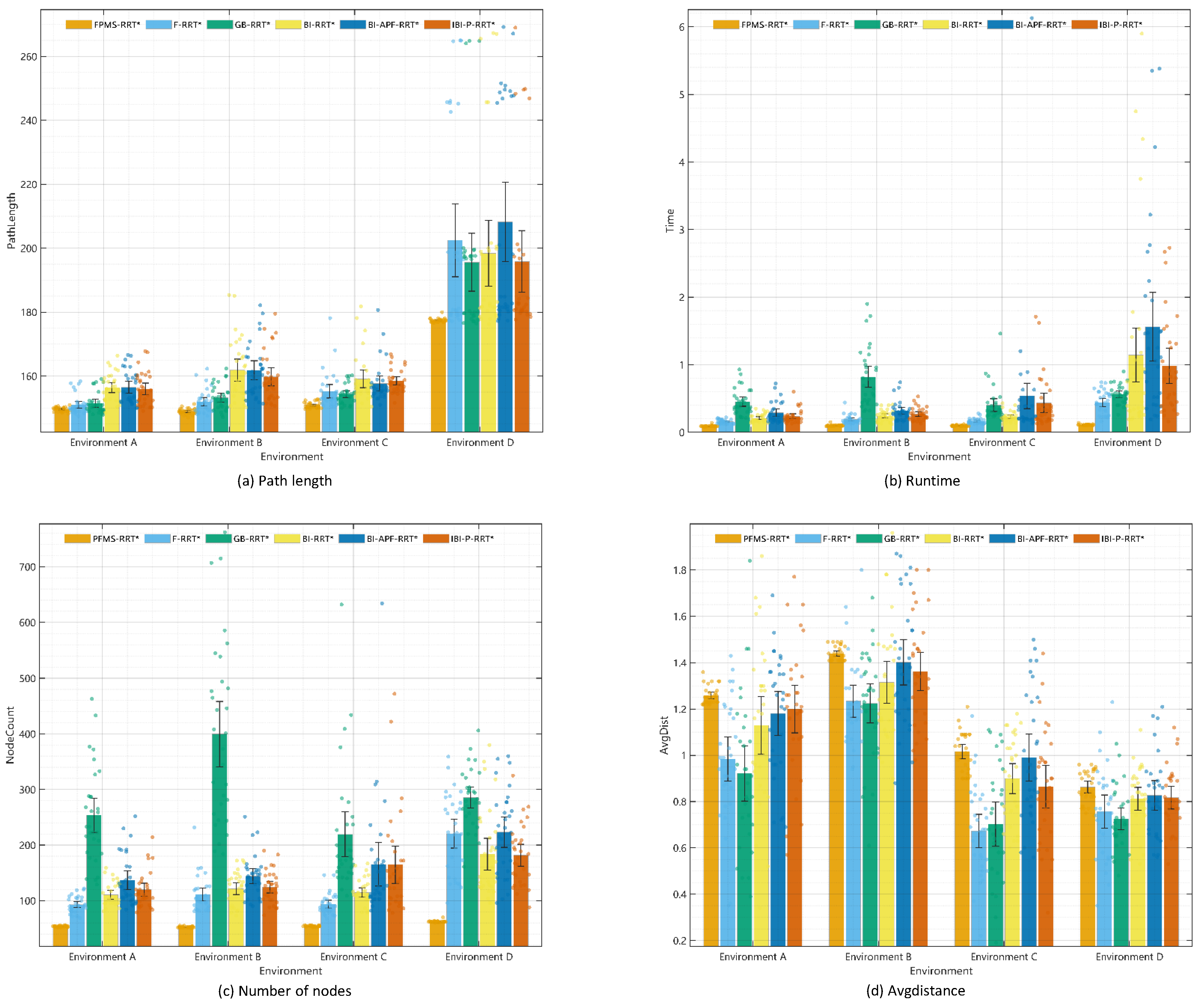 Figure 12 compares the core performance metrics of six RRT* variant algorithms across the four environments using bar charts with overlaid scatter points and 95% confidence-interval error bars. PFMS-RRT* achieves significantly shorter path lengths in all scenarios, with a particularly pronounced advantage in the challenging Environment D. F-RRT exhibits the largest variation in path length, and its mean value in Environment D is much higher than that of the other algorithms. PFMS-RRT* maintains relatively low runtime in most scenarios, with only a slight increase in Environment D. In contrast, GB-RRT* shows notably higher runtime in Environment B, and its scatter points are highly concentrated, indicating unstable efficiency in that scenario. GB-RRT* also produces consistently larger node counts across all environments, suggesting substantial redundancy in its sampling and exploration. By comparison, PFMS-RRT* maintains a low node count throughout, reflecting a more efficient sampling strategy. Moreover, the average distance between nodes and obstacles for PFMS-RRT* varies little across environments, indicating stronger planning stability, whereas F-RRT shows the most dispersed scatter distribution and the largest performance fluctuation. Overall, PFMS-RRT* delivers the best comprehensive performance over the four environments, producing shorter paths with fewer nodes, lower and more stable runtime, and improved robustness. GB-RRT* suffers from high exploration redundancy, and F-RRT exhibits large performance variability. The bidirectional variants perform between PFMS-RRT* and the single-tree methods, achieving a relatively good balance between efficiency and stability.
