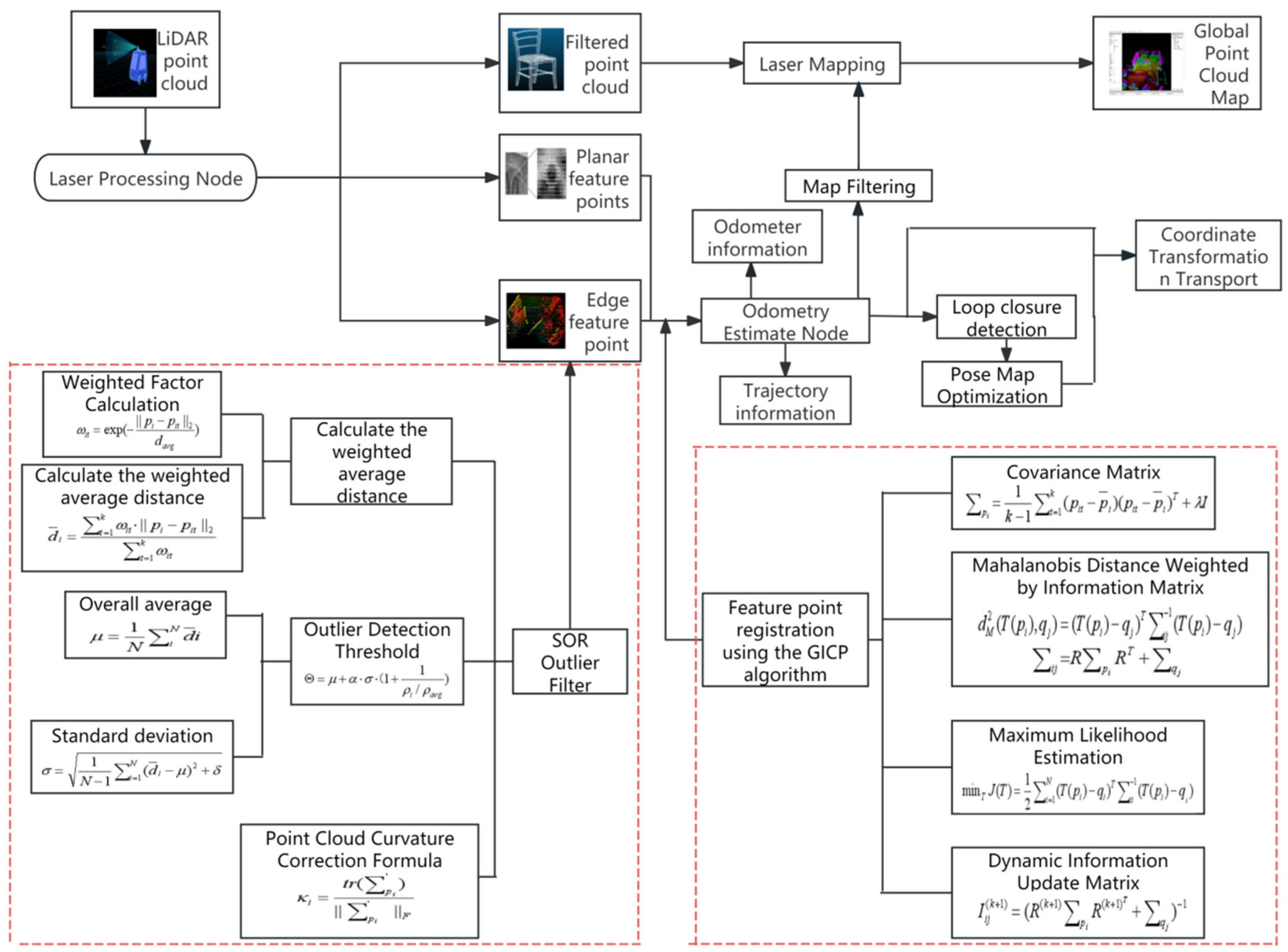 Figure 1. Improved overall process structure of the FLOAM algorithm (core improvements highlighted in red).