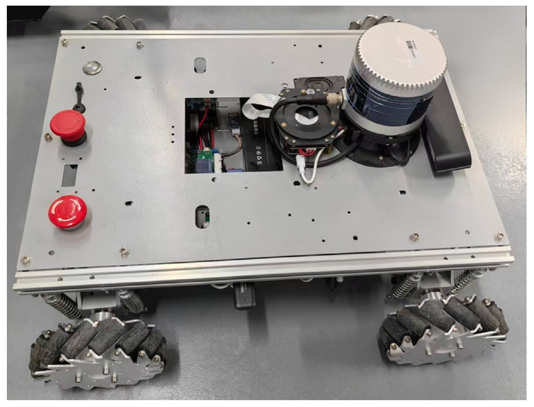 The experimental platform for this study is the Wheeltec four-wheel omnidirectional mobile robot chassis, equipped with Mecanum wheels to achieve flexible omnidirectional movement, meeting path planning and motion control requirements for both indoor and outdoor scenarios. A Leishen C16 3D LiDAR is mounted atop the platform as the sole perception sensor. This radar features 16 laser beams and 360° full-field scanning capability, with a standard scanning frequency (frame rate) of 10 Hz. It outputs real-time environmental point cloud data, providing raw perception information for algorithms. Additionally, the onboard computing unit integrated into the mobile robot used in this experiment is the NVIDIA Jetson Xavier NX. Its core configuration includes a Carmel ARM v8.2 64-bit hexa-core processor, a 384-core graphics processor based on the Volta architecture (maximum frequency 1.9 GHz), and 8 GB of LPDDR4x memory. This device represents mainstream lightweight deployment hardware in the field of mobile industrial robots, offering clear engineering and technical reference value.