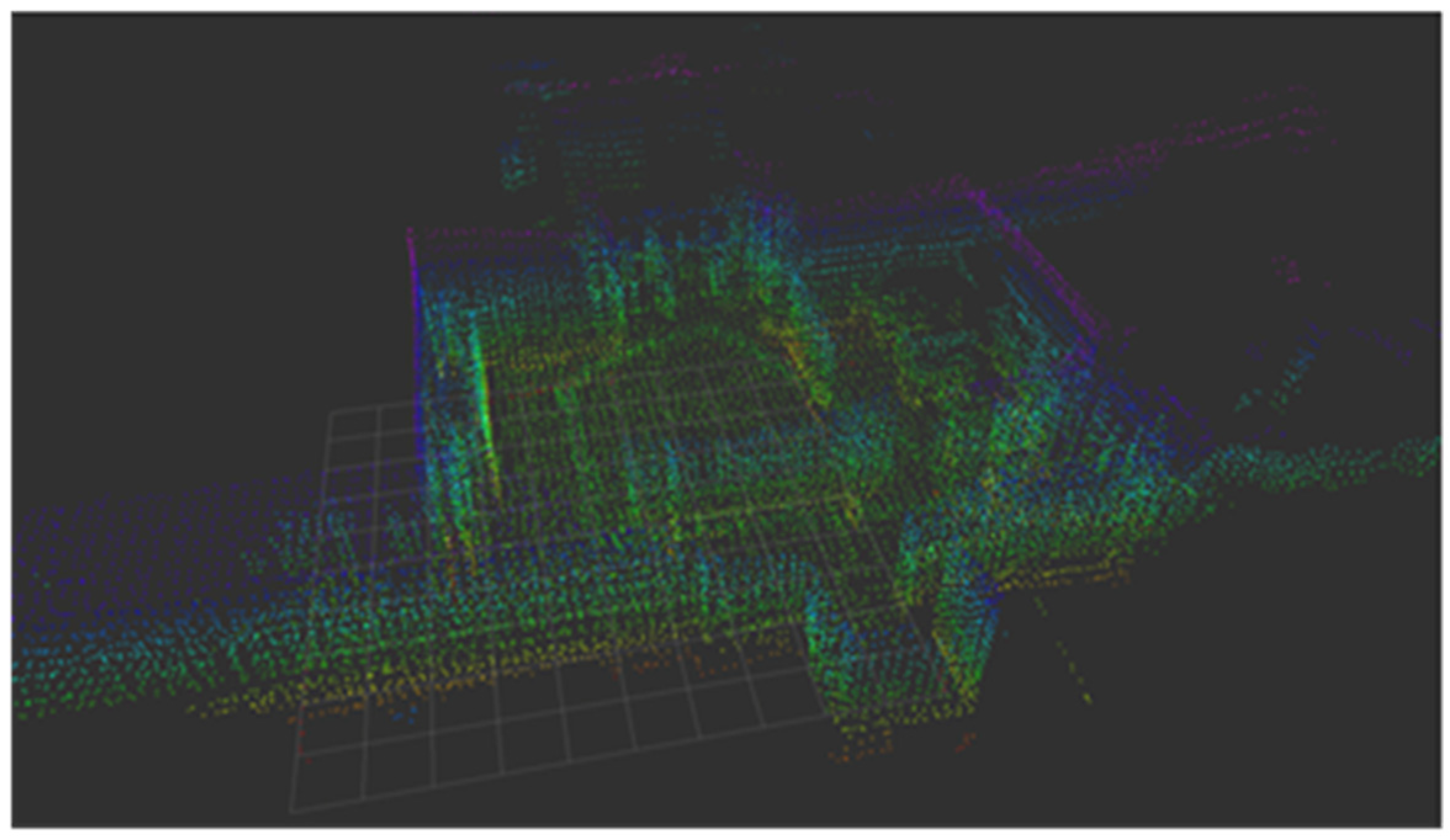 Figure 4. Improved FLOAM algorithm for indoor first-floor lobby 3D point cloud mapping (note: images are clearly visible; outdoor environment mapping successful, furthermore, the color coding in the figure corresponds to the Z-axis height of the point cloud in the robot’s global coordinate system: warm colors (red, yellow) indicate lower height values, while cool colors (blue, purple) indicate higher height values; the black grid represents the two-dimensional horizontal reference plane in the global coordinate system.).