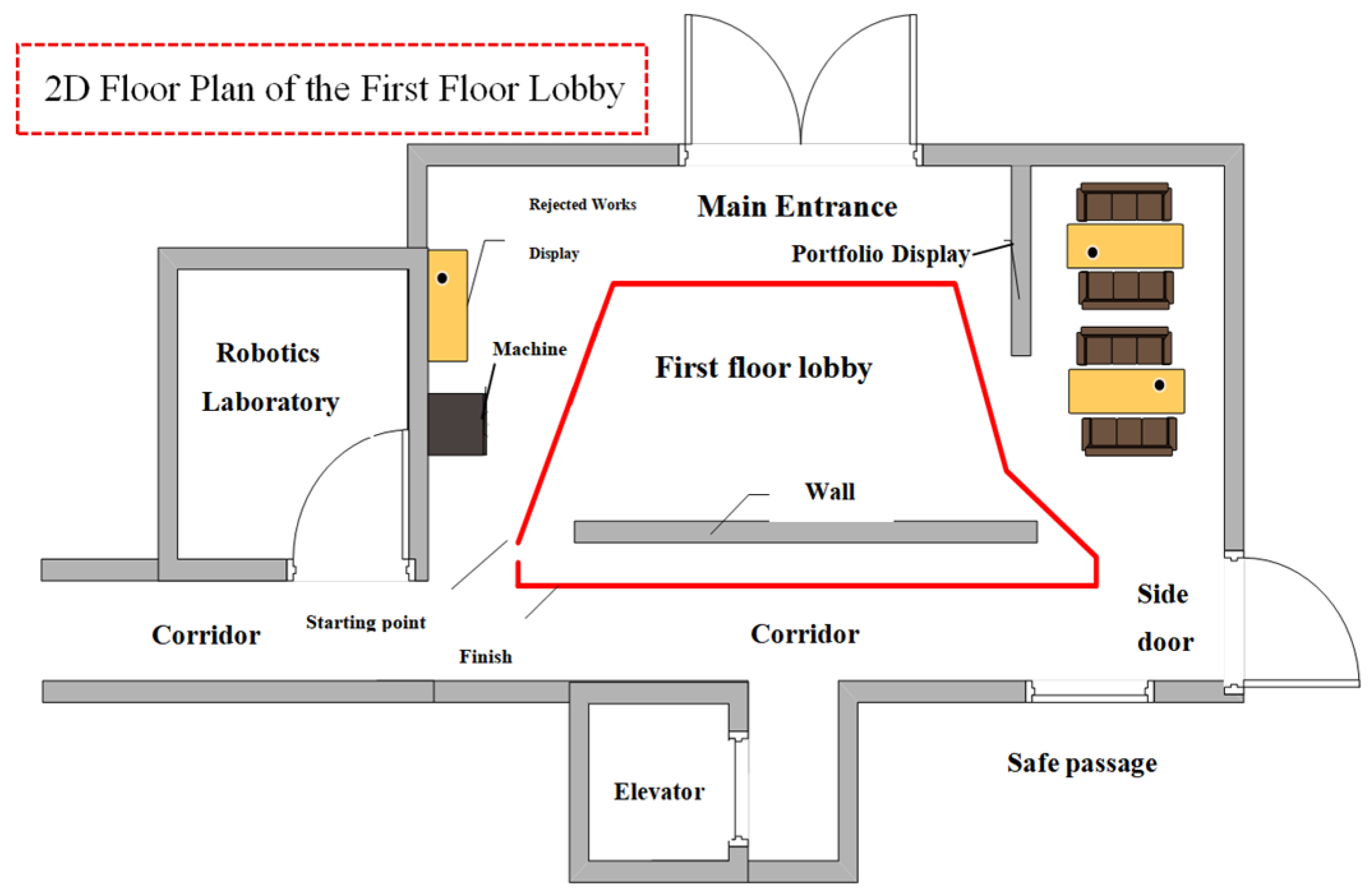 Figure 5. Two-dimensional floor plan of the first-floor lobby (note: the red line indicates the robot’s path on the 2D floor plan).