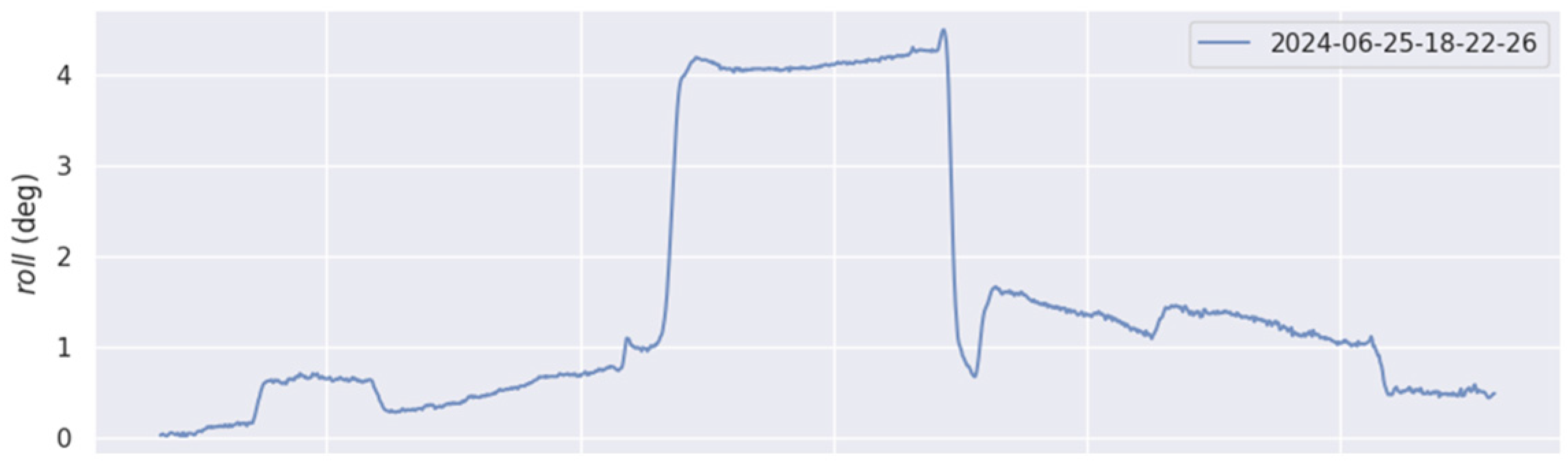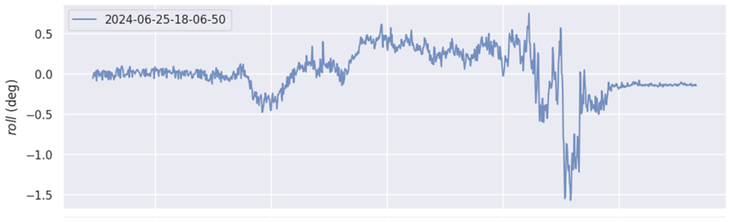 Figure 17. Time-dependent curve of robot roll angle in outdoor scenarios (note: the improved algorithm fluctuates around zero overall).