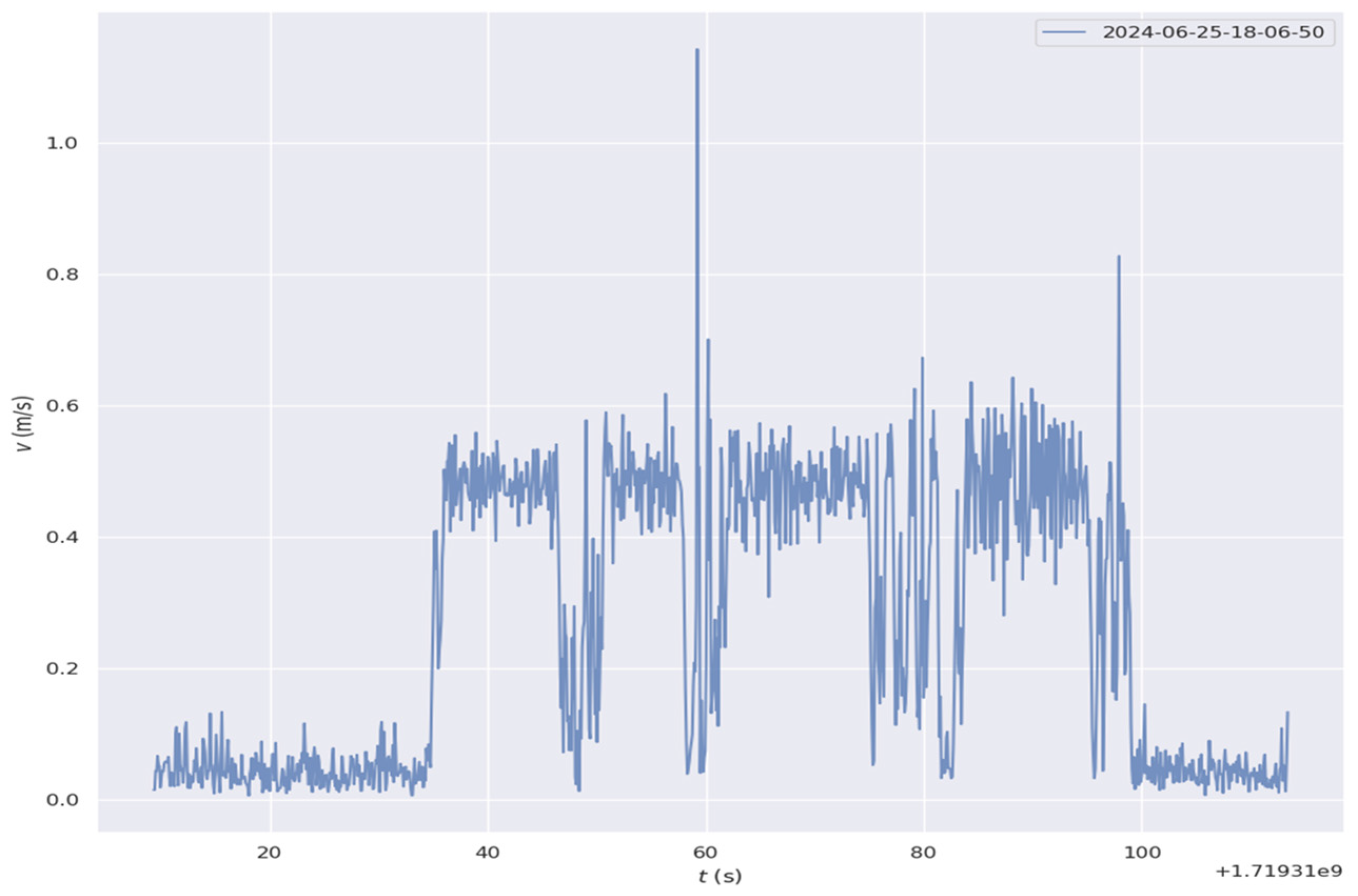 Figure 20. Time-based speed variation curve for outdoor robot movement (note: the robot is subject to speed fluctuations when in motion, while outdoor settings affect the algorithm’s performance).
