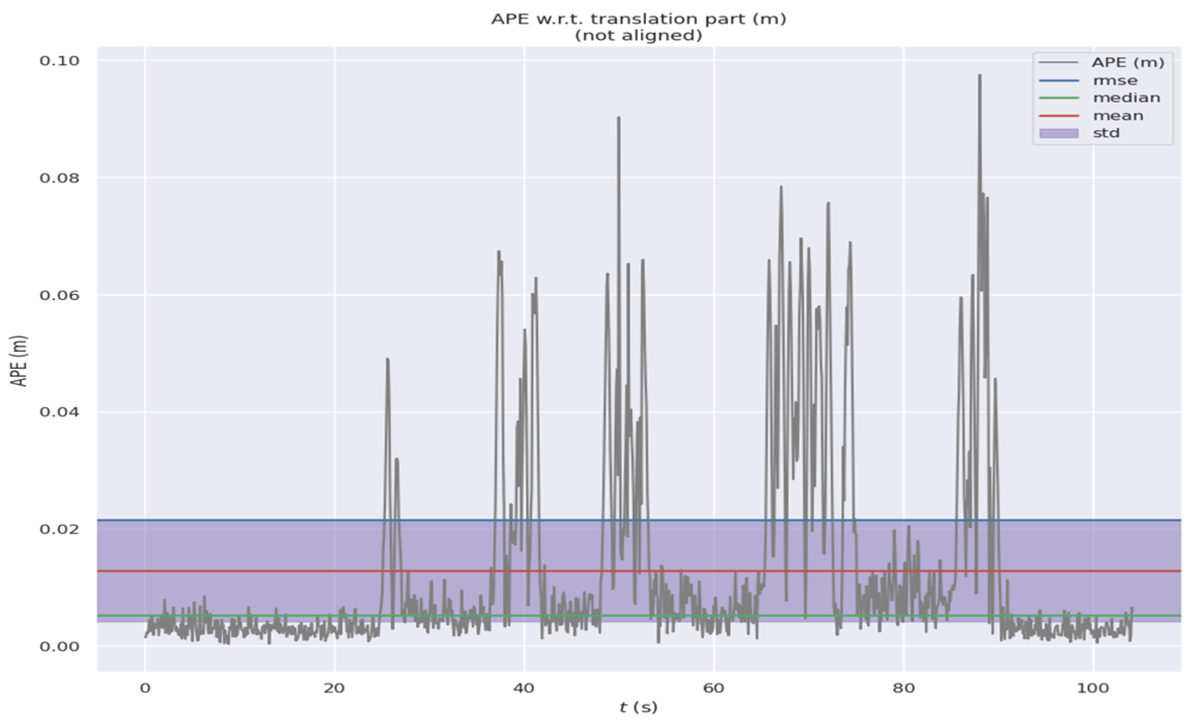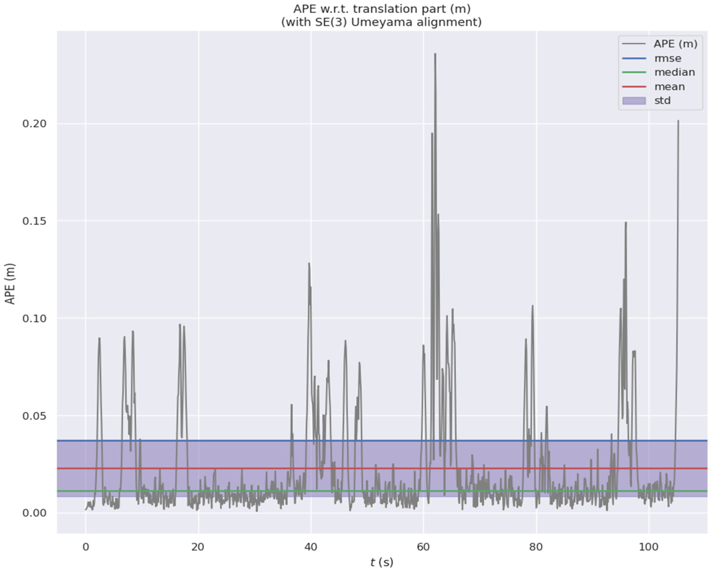 Figure 11. Time-dependent absolute pose error curve of the improved FLOAM algorithm in indoor experiments (note: the error range is within 0 and 0.02; loop closure detection is carried out successfully and the SOR filter is used for offline experiments).