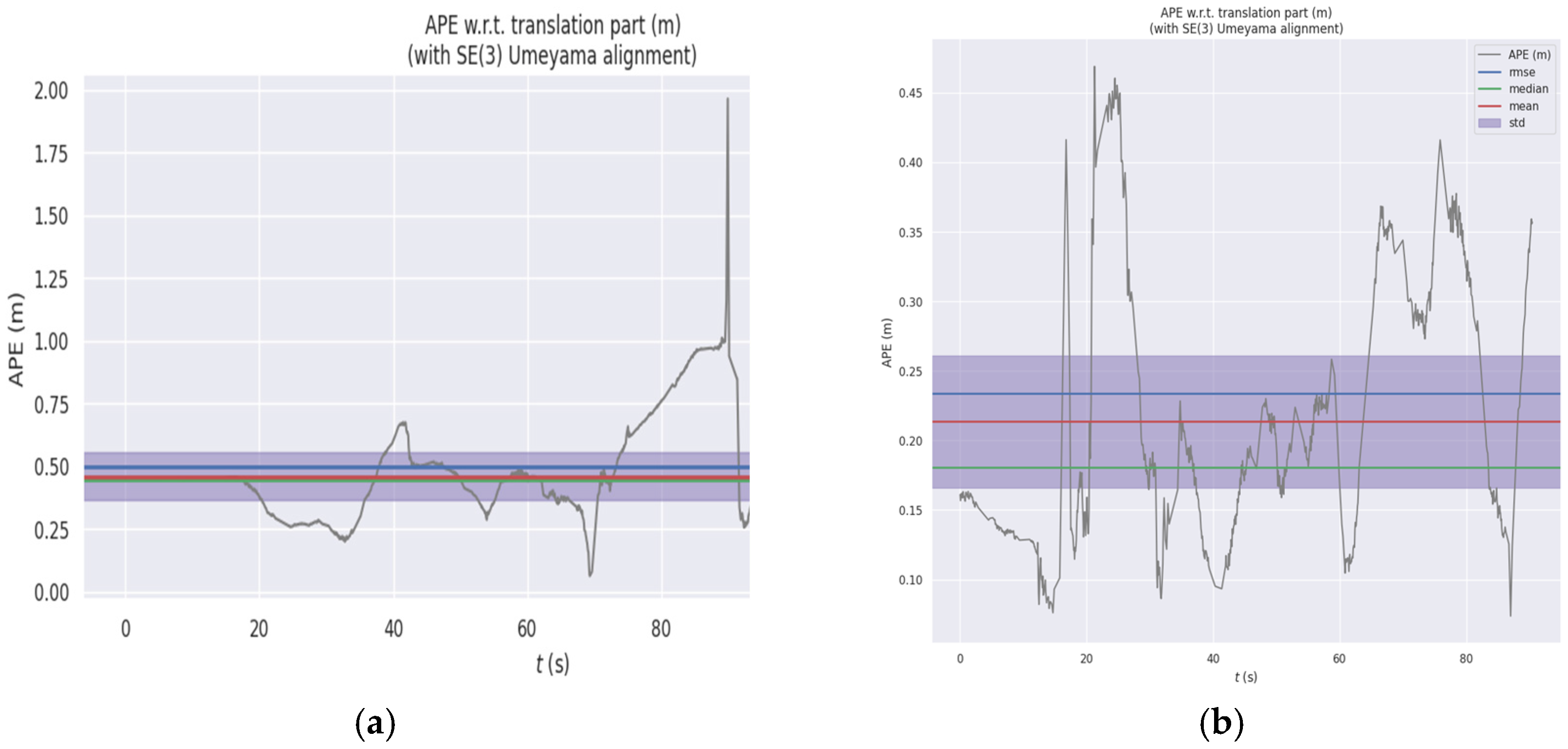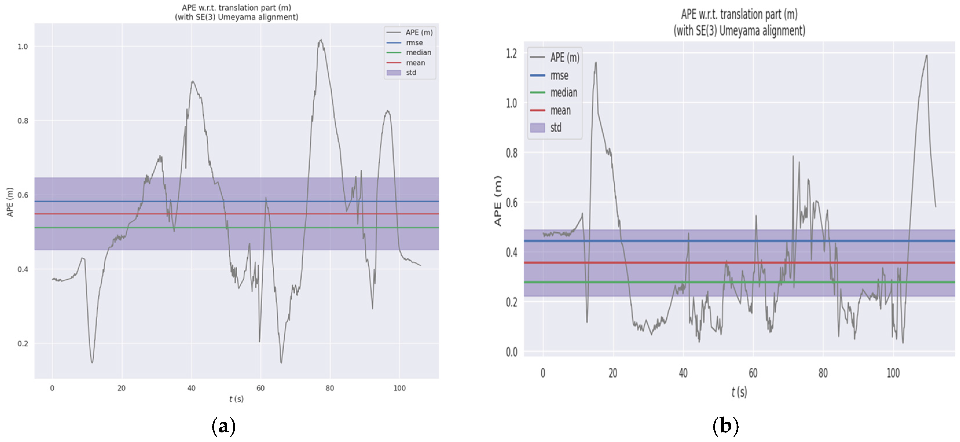 Figure 22. Time-dependent variation curve of absolute pose error in outdoor simulation of the improved FLOAM algorithm (note: (a) represents the APE curve of the traditional FLOAM algorithm; (b) represents the APE curve of the improved FLOAM algorithm).