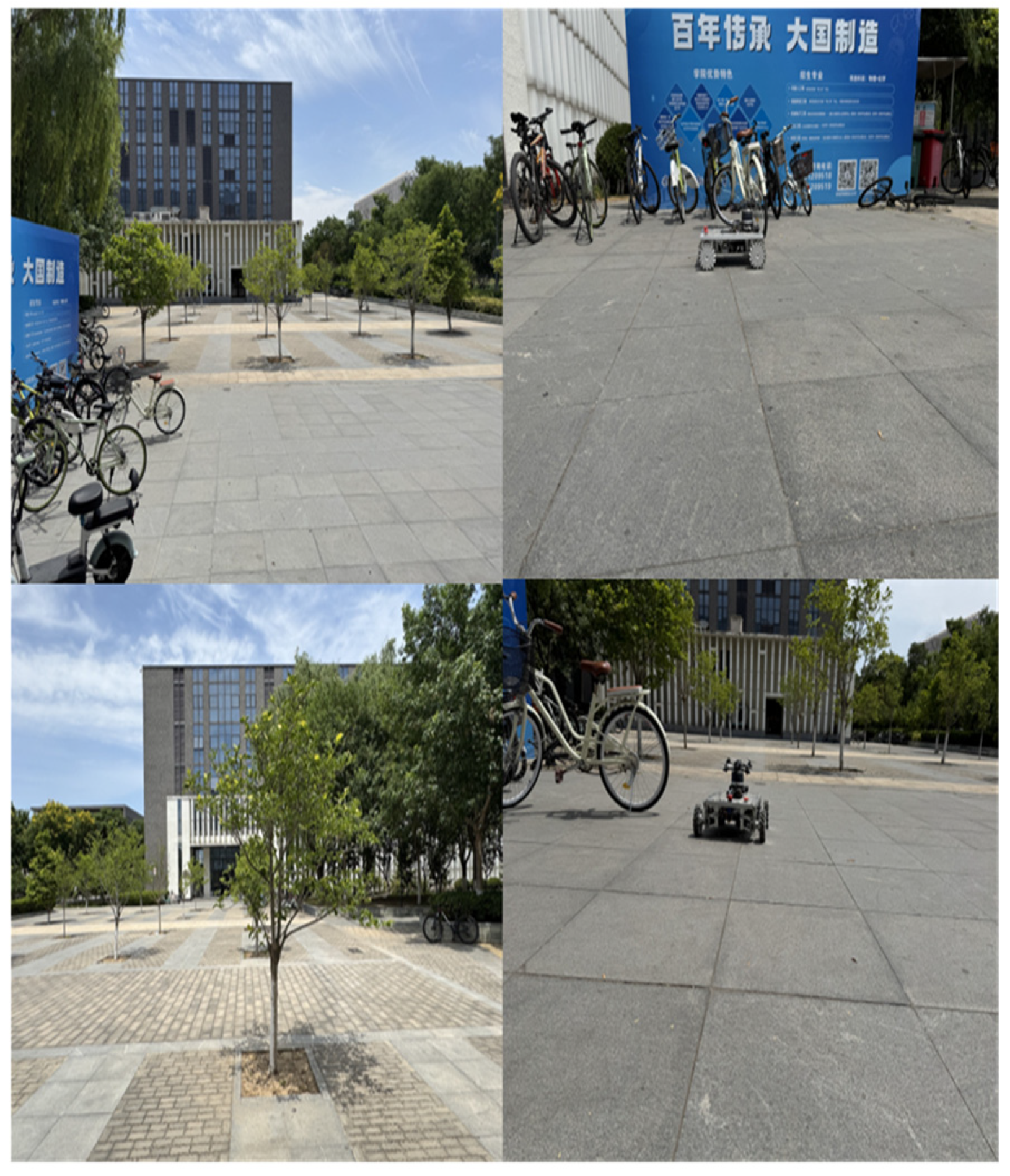Figure 13. Outdoor experimental testing environment (open plaza at the entrance of the academic building) (note: the two images on the left show an outdoor environment filled with various distractions, while the two images on the right show the robot activated and ready to move. the non-English words in the images are the college’s motto).