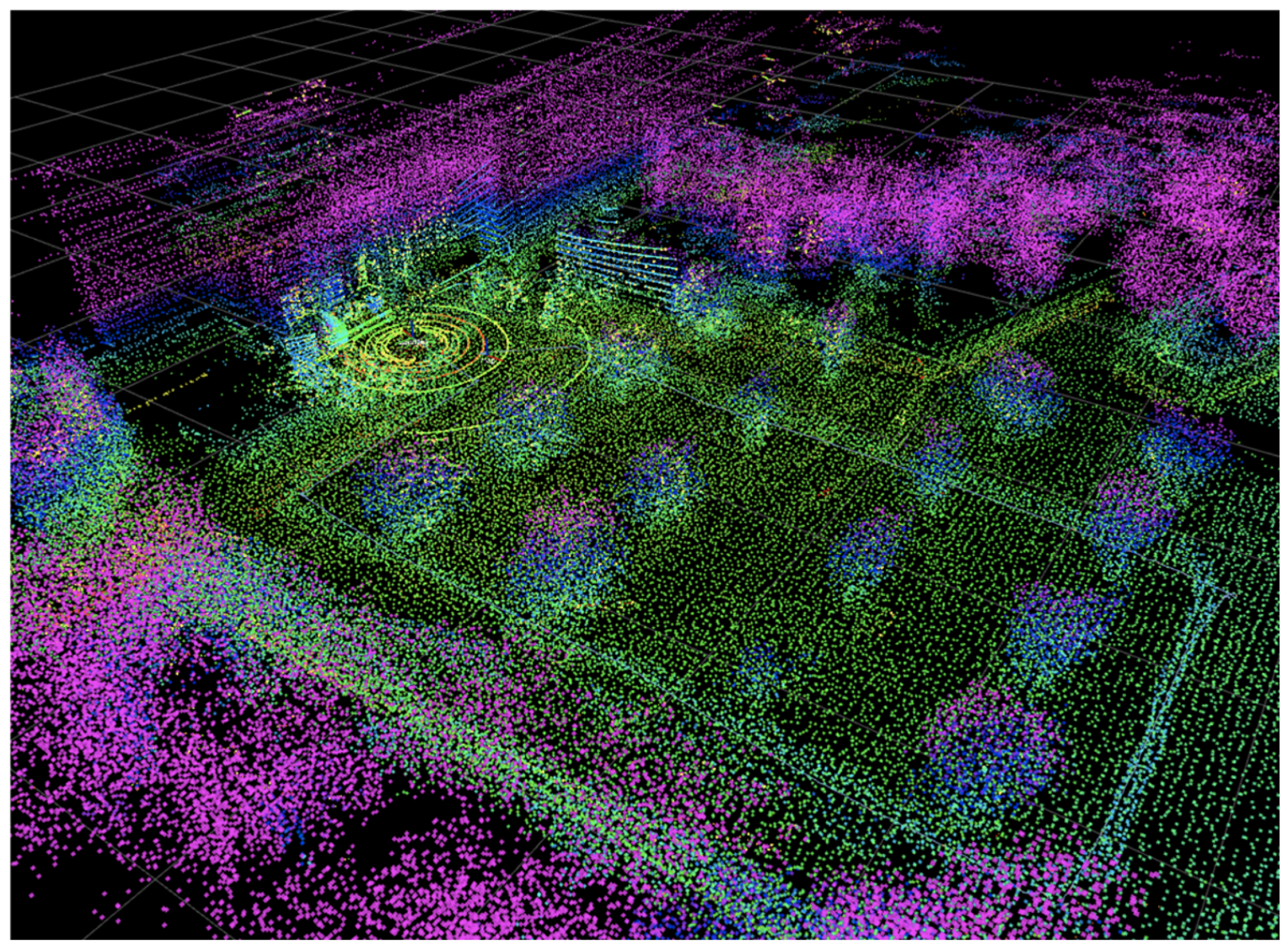 Figure 14. FLOAM algorithm’s 3D point cloud mapping performance at the entrance of an outdoor academic building was improved (note: the generated maps are clearly visualized, and effective outdoor scene mapping is achieved. Furthermore, the color coding corresponds to the Z-axis elevation (height) of the point cloud in the robot global coordinate system: warm colors (red, yellow) represent low elevation values (including the robot’s real-time motion trajectory in the center of the figure), while cool colors (blue, purple) represent high elevation values (such as the top of vegetation and building structures in the scene). The black grid denotes the 2D horizontal reference plane of the global coordinate system).