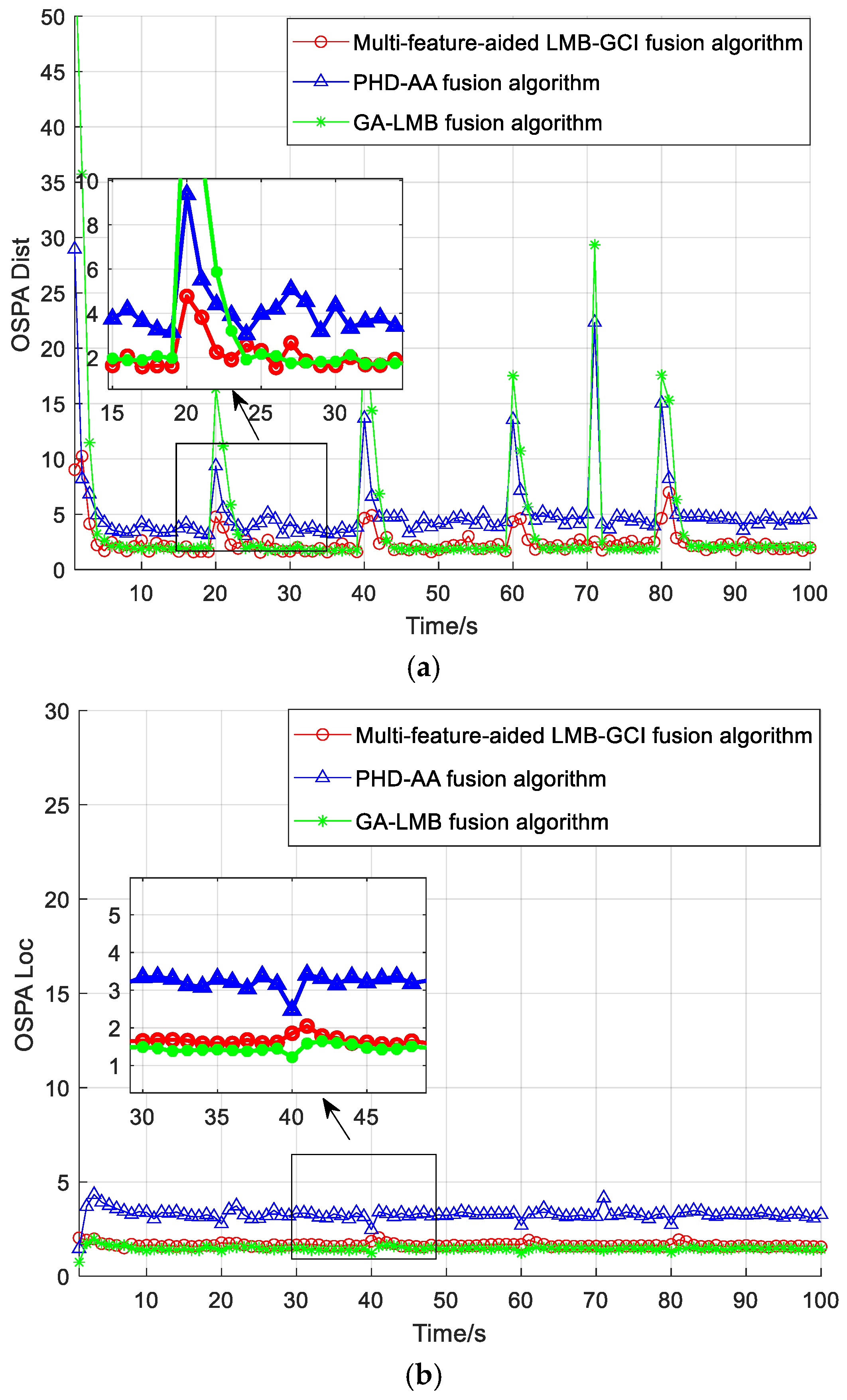 | Fusion Algorithms | OSPA Total Error (m) | Location Components of OSPA (m) | Cardinality Components of OSPA (m) | Computational Time (s) |