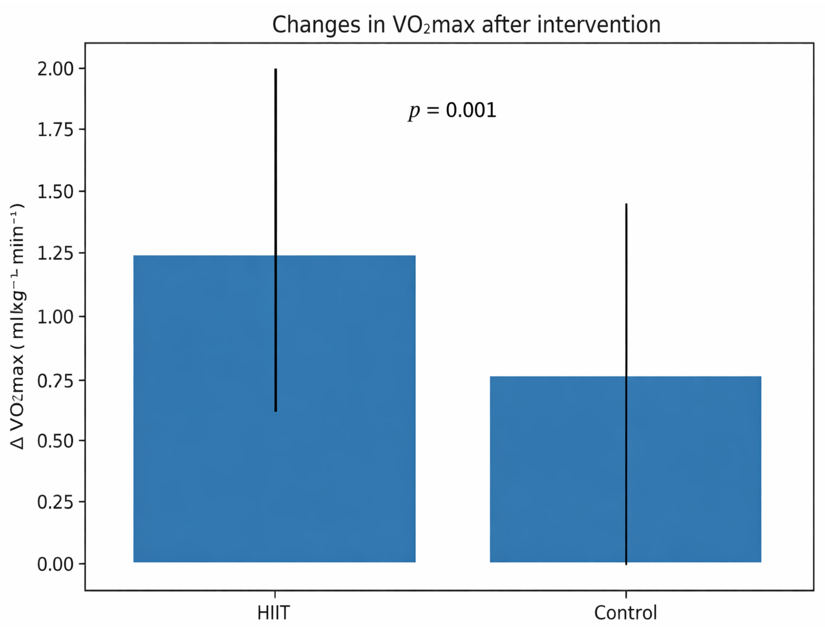 2max values compared with the control group, confirming that the observed improvement in aerobic capacity was attributable to the HIIT intervention.
