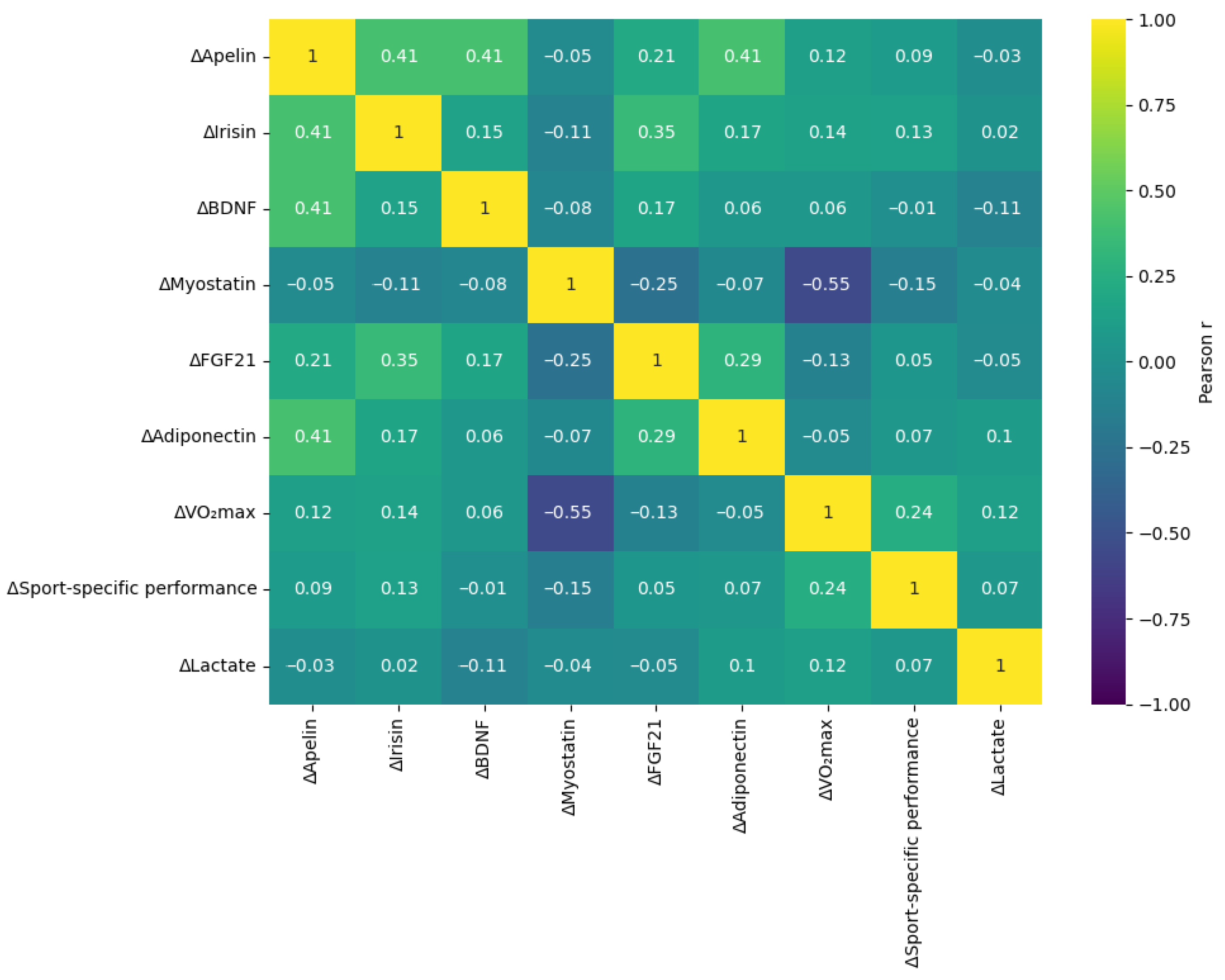 2max (r = −0.55), indicating that greater reductions in myostatin were associated with larger improvements in aerobic capacity. Moderate positive associations were observed for ΔIrisin (r = 0.36) and ΔApelin (r = 0.32), while BDNF demonstrated a weaker relationship with aerobic adaptation (r = 0.29). In contrast, FGF21 and adiponectin showed relatively small correlations with changes in VO