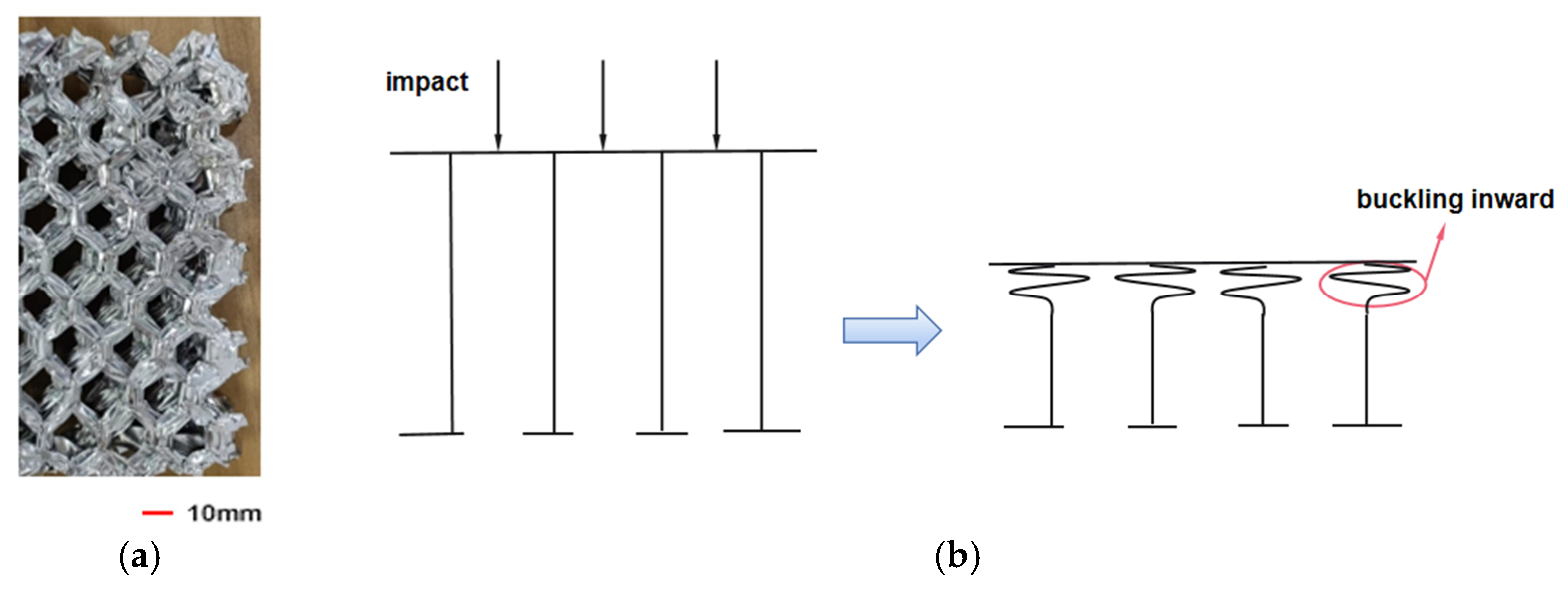 - Zarei Mahmoudabadi, M.; Sadighi, M. A study on the static and dynamic loading of the foam filled metal hexagonal honeycomb—Theoretical and experimental. Mater. Sci. Eng. A 2011, 530, 333–343. [Google Scholar] [CrossRef]