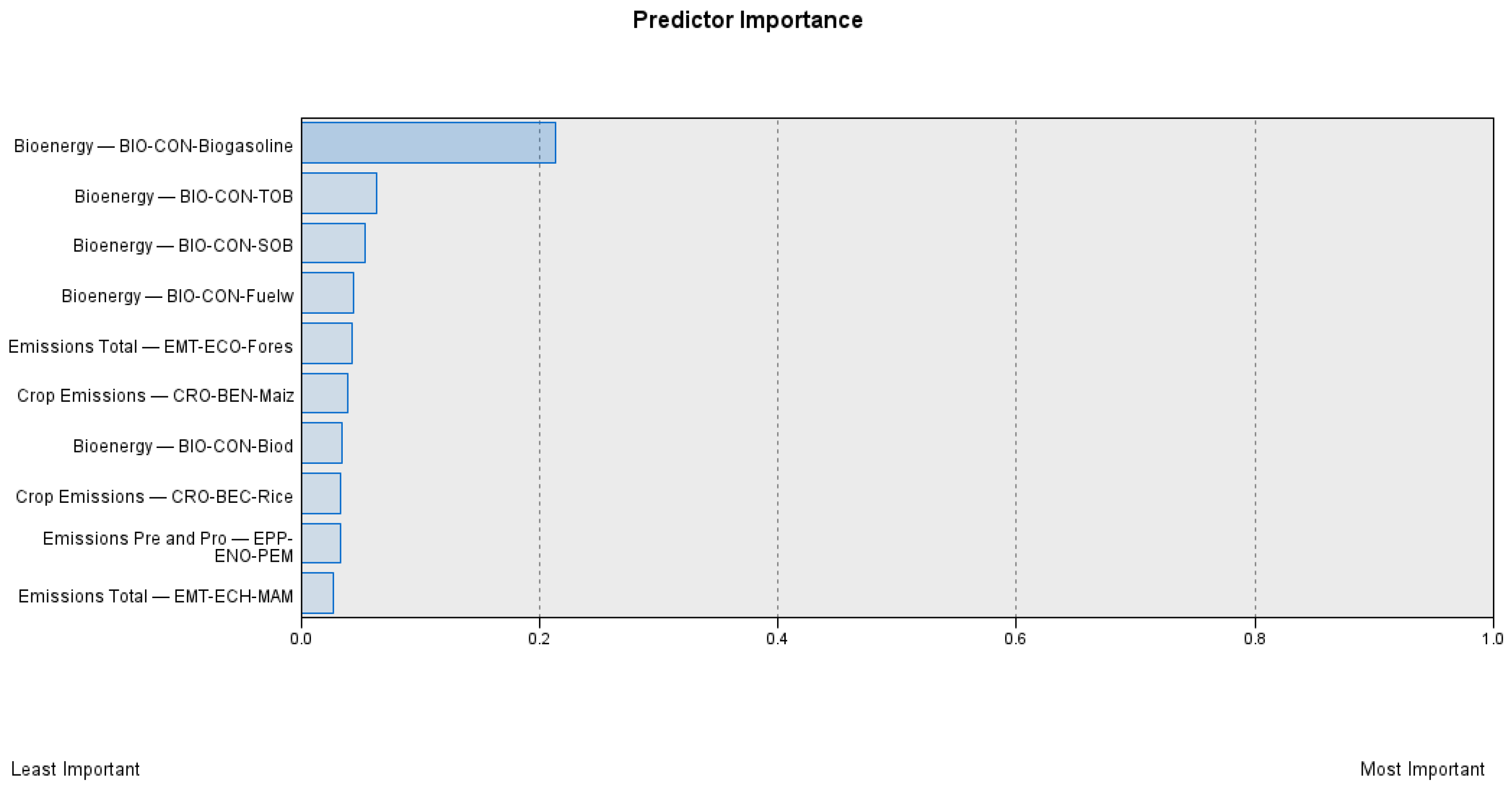 The most important predictors for bioenergy production in 2023. Note: Bioenergy BIO-CON-Biogasoline (bioenergy consumption-biogasoline, Tj); Bioenergy BIO-CON-TOB (total bioenergy consumption, Tj); Bioenergy BIO-CON-SOB (bioenergy consumption-solid biofuels, Tj); Bioenergy BIO-CON-Fuelw (bioenergy consumption-fuelwood, Tj); Emissions Total EMT-ECO-Fores (emissions CO2-forestland, kt); Crop Emissions CRO-BEN-Maiz (burning crop residues-emissions N2O-maize, kt); Bioenergy BIO-CON-Biod (energy consumption-biodiesel, Tj); Crop Emission CRO-BEC-Rice (burning crop residues-emissions CH4-rice, kt); Emissions Pre and Pro EPP-ENO-PEM (emissions N2O-pesticides manufacturing, kt); Emissions Total EMT-ECH-MAM (emissions CH4-manure management, kt).