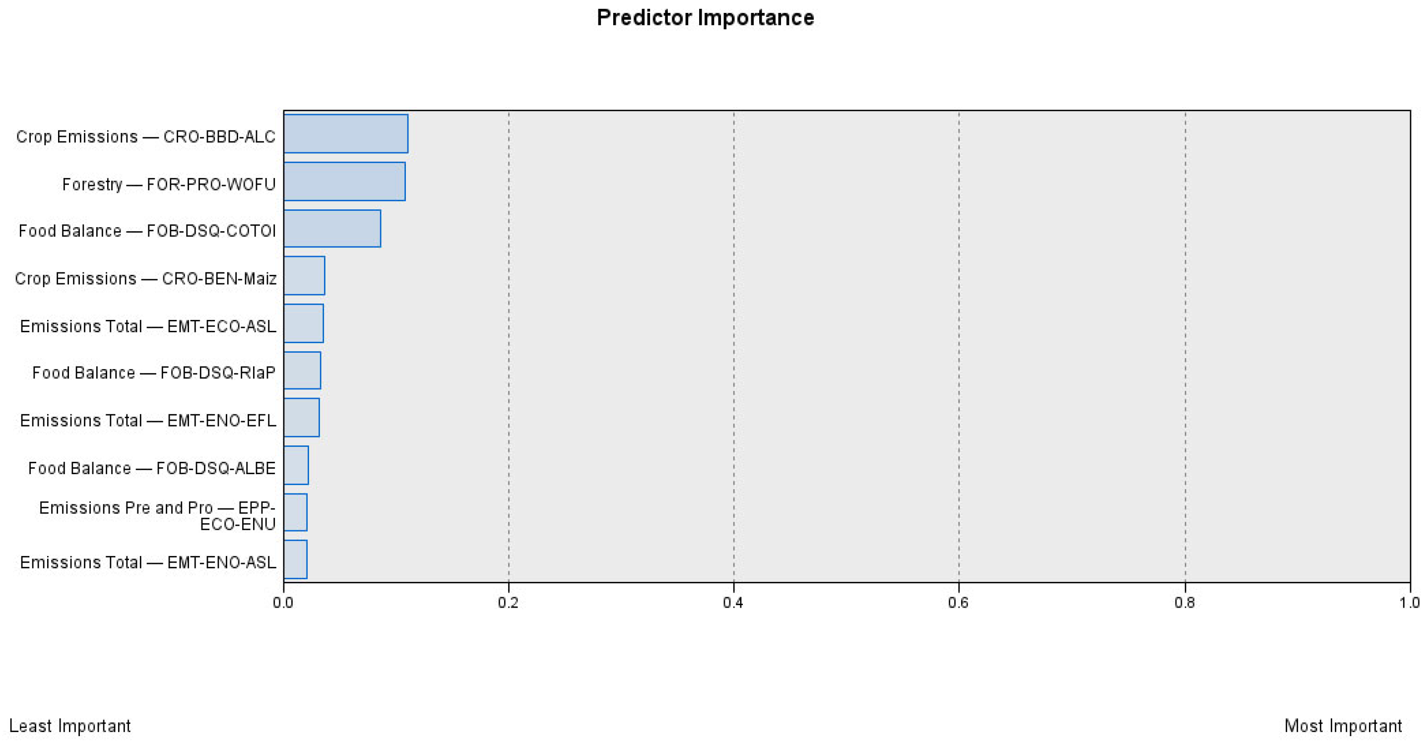 The most important predictors for bioenergy production (without inputs for different types of bioenergy production and bioenergy consumption), in 2023. Note: Crop Emissions CRO-BBD-ALC (burning crop residues-biomass burned dry matter-all crops, t); Forestry FOR-PRO-WOFU (production-wood fuel, m3); Food Balance FOB-DSQ-COTOI (domestic supply quantity-cottonseed oil, 1000 t); Crop Emissions CRO-BEN-Maiz (burning crop residues-emissions N2O-maize, kt); Emissions Total EMT-ECO-ASL (emissions CO2-all sectors with LULUCF); Food Balance FOB-DSQ-RIaP (domestic supply quantity-rice and products, 1000 t); Emissions Total EMT-ENO-EFL (emissions N2O-emissions from livestock, kt); Food Balance FOB-DSQ-ALBE (domestic supply-alcoholic beverages, 1000 t); Emissions Pre and Pro EPP-ENO-ENU (emissions N2O-energy use, kt); Emissions Total EMT-ENO-ASL (emissions N2O-all sectors with LULUCF).