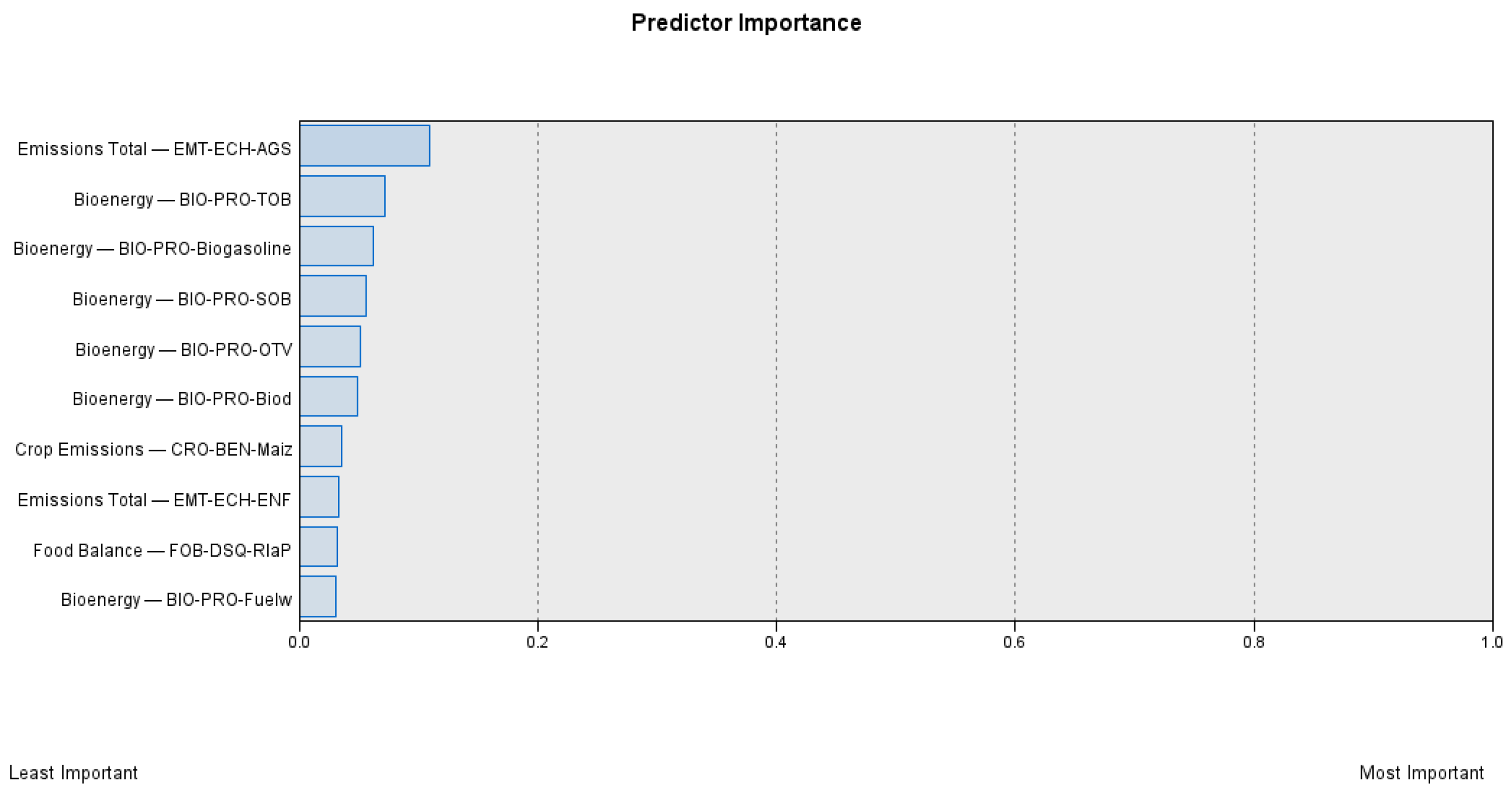 The most important predictors for bioenergy consumption in 2023. Note: Emissions Total EMT-ECH-AGS (emissions CH4-agrifood systems, kt); Bioenergy BIO-PRO-TOB (total bioenergy production, Tj); Bioenergy BIO-PRO-Biogasoline (bioenergy production-biogasoline, Tj); Bioenergy BIO-PRO-SOB (bioenergy production-solid biofuels, Tj); Bioenergy BIO-PRO-OTV (bioenergy production-other vegetal material and residues, Tj); Bioenergy BIO-PRO-Biod (bioenergy production-biodiesel, Tj); Crop Emissions CRO-BEN-Maiz (burning crop residues-emissions N2O-maize, kt); Emissions Total EMT-ECH-ENF (emissions CH4-enteric fermentation, kt); Food Balance FOB-DSQ-RIaP (domestic supply quantity-rice and products, 1000 t); Bioenergy BIO-PRO-Fuelw (bioenergy production-fuelwood, Tj).