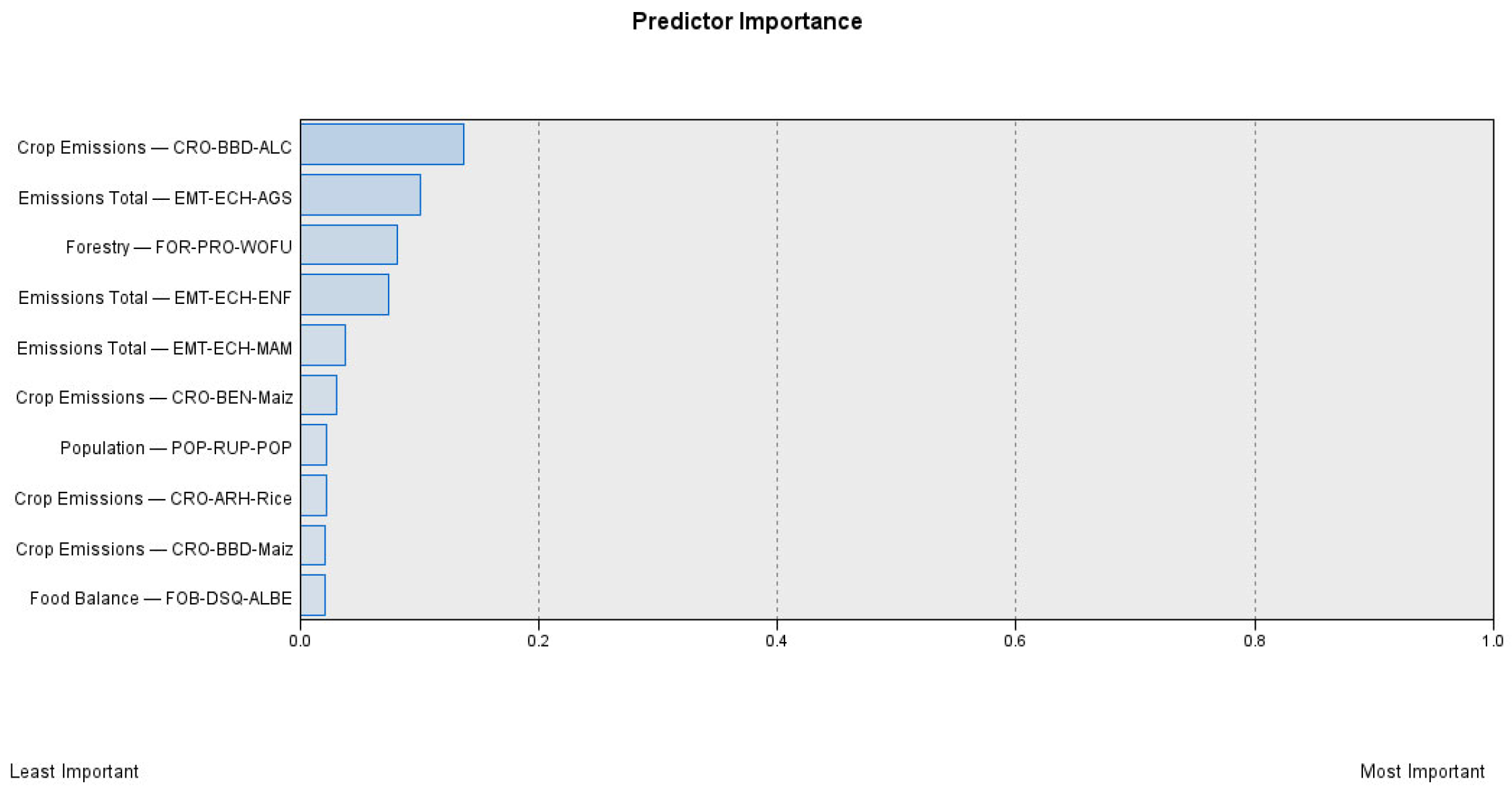The most important predictors for bioenergy consumption (without inputs for different types of bioenergy production and bioenergy consumption), in 2023. Note: Crop Emissions CRO-BBD-ALC (burning crop residues-biomass burned dry matter-all crops, t); Emissions Total EMT-ECH-AGS (emissions CH4-agrifood systems, kt); Forestry FOR-PRO-WOFU (production-wood fuel, m3); Emissions Total EMT-ECH-ENF (emissions CH4-enteric fermentation, kt); Emissions Total EMT-ECH-MAM (emissions CH4, manure management, kt); Crop Emissions CRO-BEN-Maiz (burning crop residues-emissions N2O-maize, kt); Population POP-RUP-POP (rural population, 1000 persons); Crop Emission CRO-ARH-Rice (area harvest-rice, ha); Crop Emissions CRO-BBD-Maiz (burning crop residues-biomass burned dry matter-maize, t); Food Balance FOB-DSQ-ALBE (domestic supply quantity-alcoholic beverages, 1000 t).