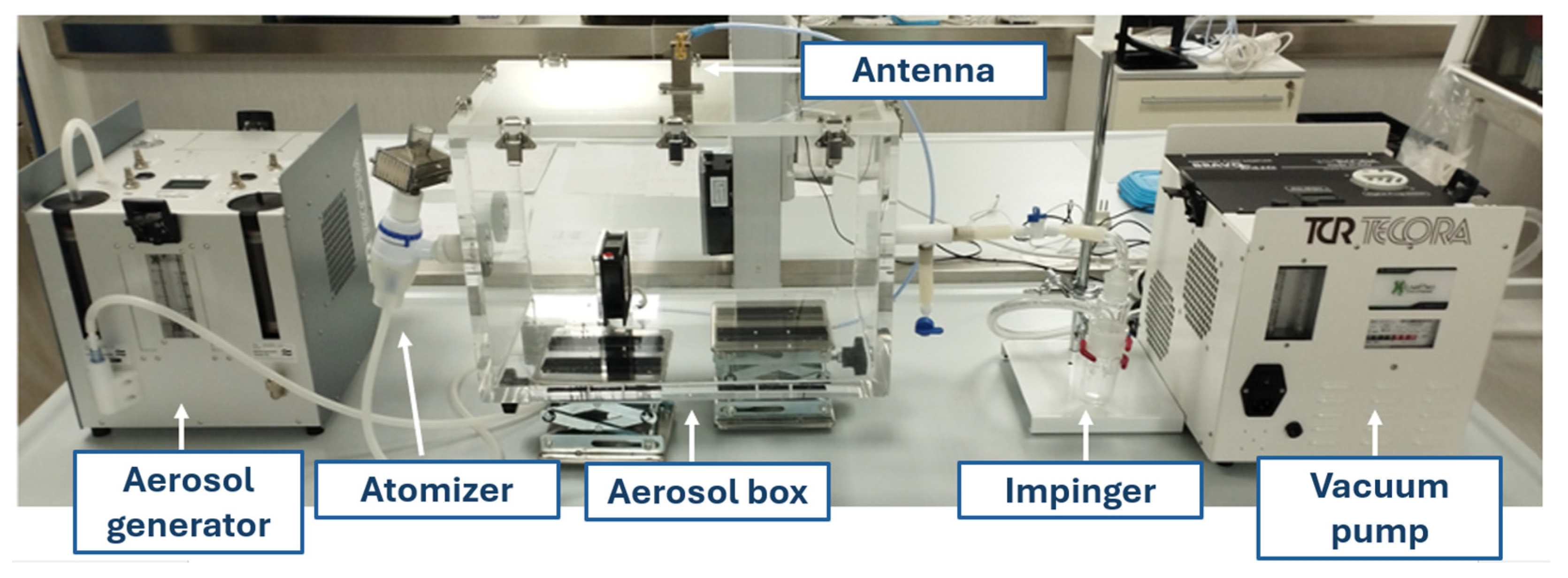- Bartocci, M.; Bia, P.; Manna, A.; Pasculli, N. SARS-CoV-2 and H1N1 Inactivation in Aerosol by Means of Radiated Microwaves with Novel Setup. In 2024 IEEE International Symposium on Antennas and Propagation and INC/USNC-URSI Radio Science Meeting (AP-S/INC-USNC-URSI); IEEE: New York, NY, USA, 2024; pp. 2393–2394. [Google Scholar]