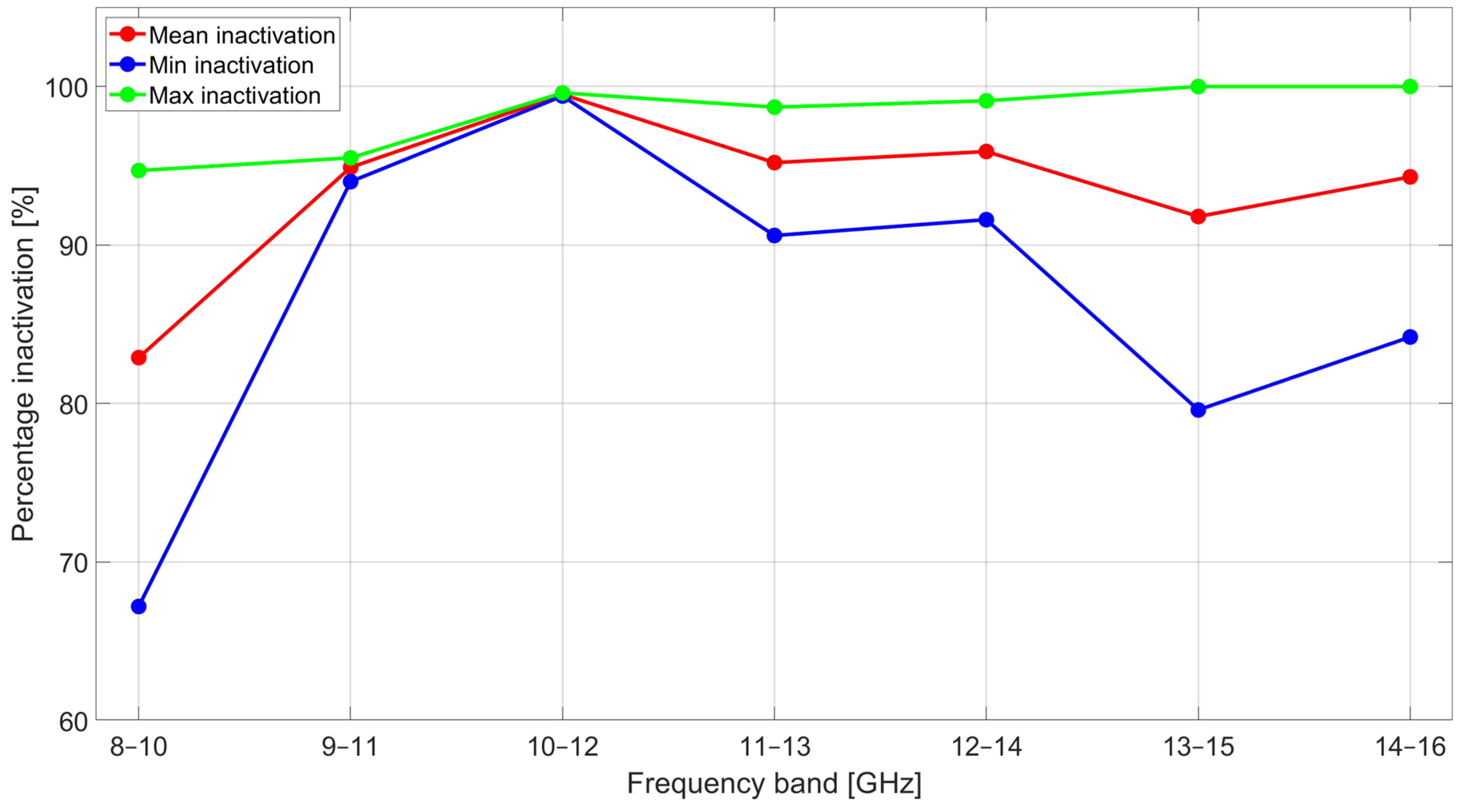 | Frequency Band [GHz] | Mean Viral Titer [TCID50, /mL] | Min Inactivation [%] | Mean Inactivation [%] | Max Inactivation [%] |