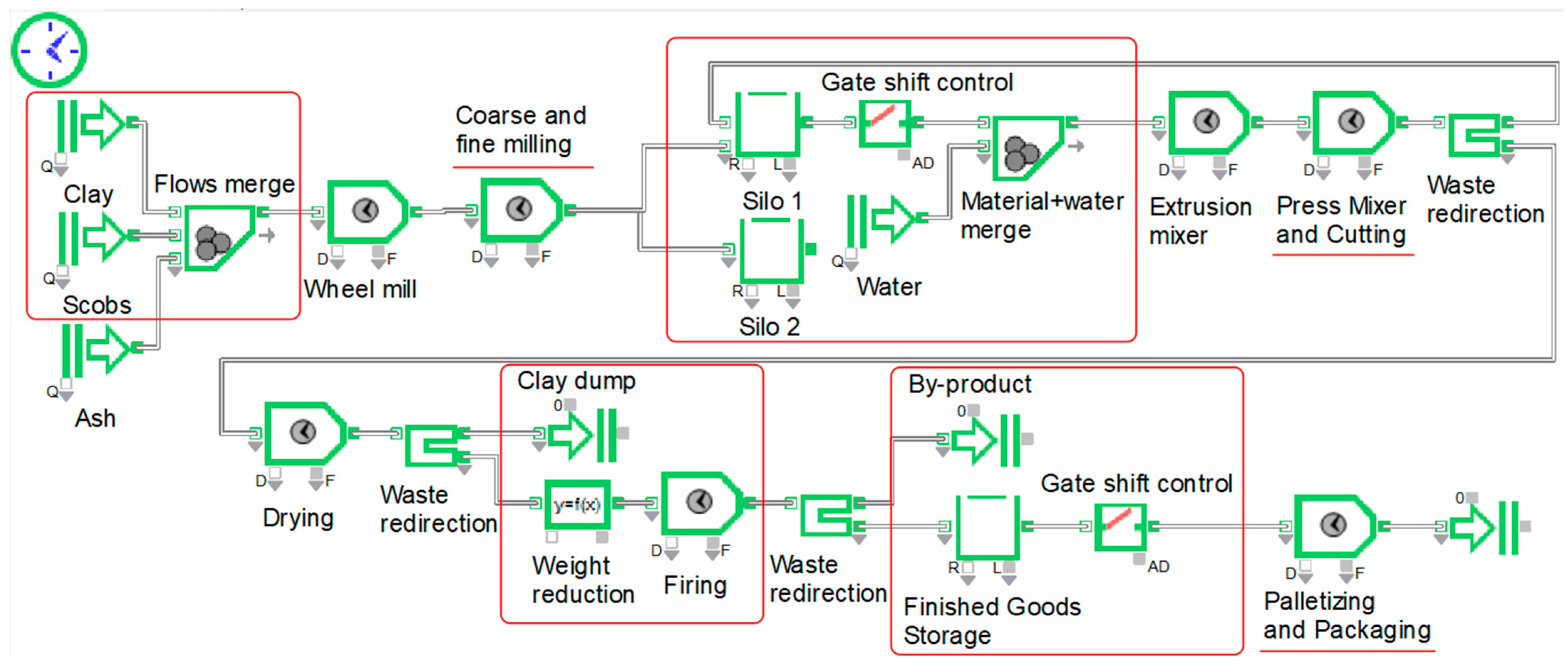 Figure 4, where Batch blocks have been replaced by Select Item In blocks. Model validation identified no further errors. Upon simulation run, this model achieves an output of 9718 tons with utilization rates of 56% for wet semi-finished product manufacturing, 99.9% for finished product manufacturing, and 48% for dispatch operations. These outputs closely match the benchmark model results.