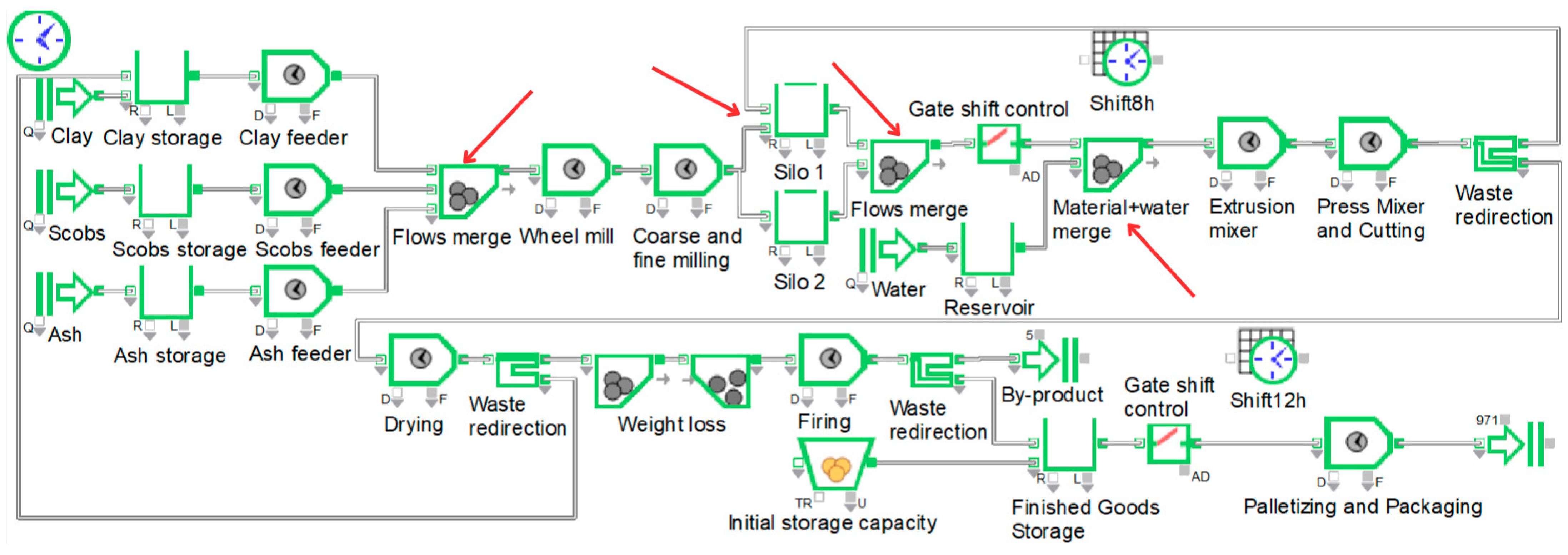 Figure 3 depicts a nearly correct and more complex ExtendSim model resulting from applying these procedures. The simulation software now executes runs, yielding an output of 971 tons instead of the case study benchmark of 9721 tons. Red arrows in the figure denote the four remaining unresolved entity flow merging issues, which cause the low simulation output.