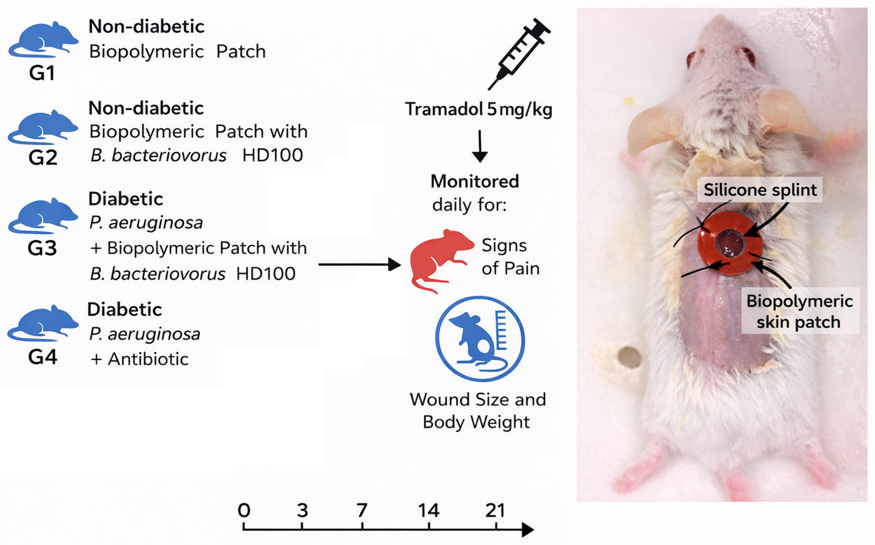 Following treatment, mice were monitored daily for up to 21 days for signs of infection, inflammation, abnormal behavior, or distress. Wound healing progression was documented through regular measurement of wound diameter, and any adverse events were recorded in accordance with institutional animal welfare guidelines.