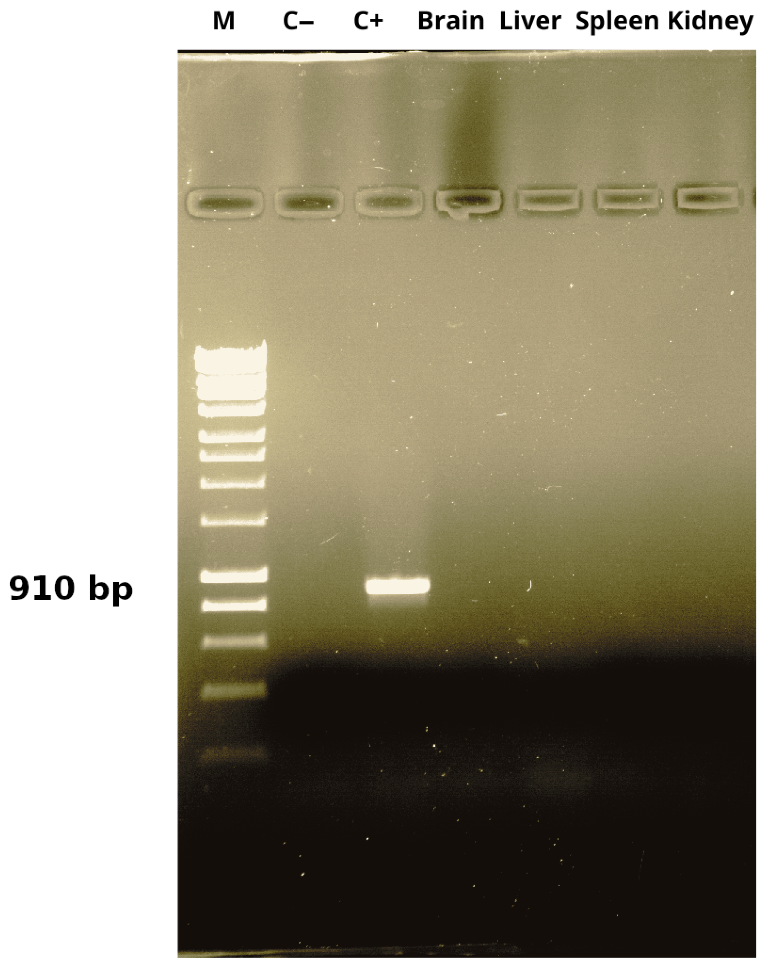 Brain, liver, spleen, and kidney tissues were aseptically harvested immediately after euthanasia. Approximately 50 mg of each tissue sample was placed in sterile 1.5 mL microcentrifuge tubes and mechanically homogenized. Genomic DNA was extracted using the phenol–chloroform method with proteinase K digestion. Briefly, samples were incubated with proteinase K at 56 °C until complete tissue digestion was achieved. After cooling to room temperature, an equal volume of phenol:chloroform:isoamyl alcohol (25:24:1, v/v/v) was added, and the samples were vortexed for 30 s and centrifuged at 12,000 for 10 min.