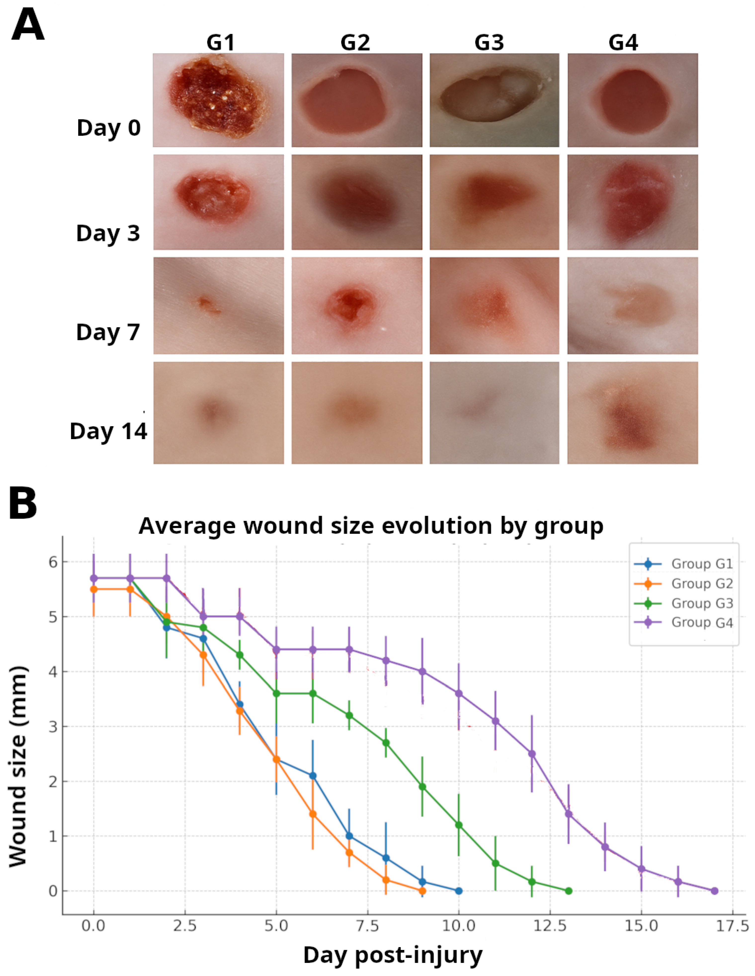 Figure 4, which illustrates clear differences in wound closure rates among the experimental groups. Daily wound closure percentages for groups G1–G4 are summarized in